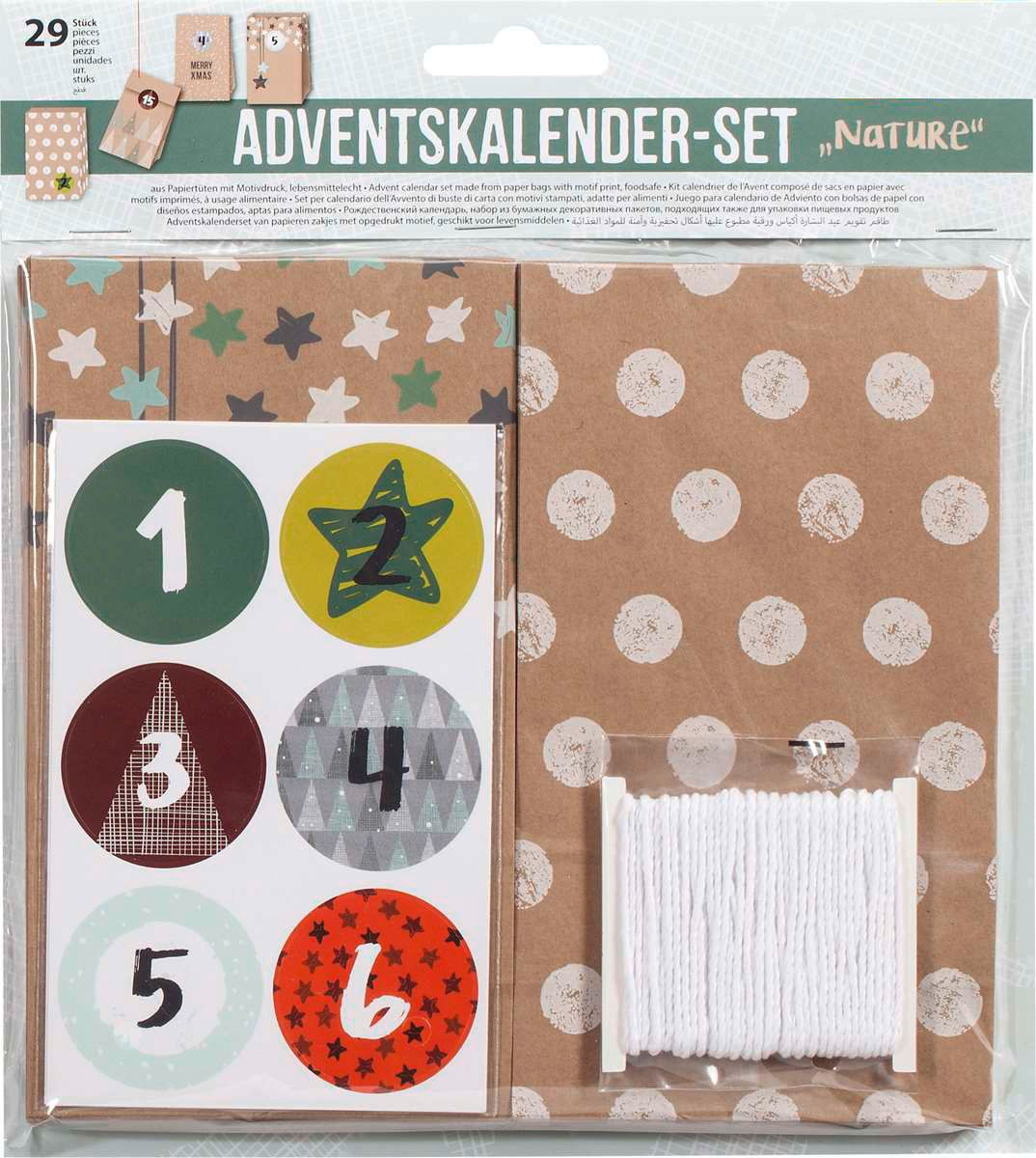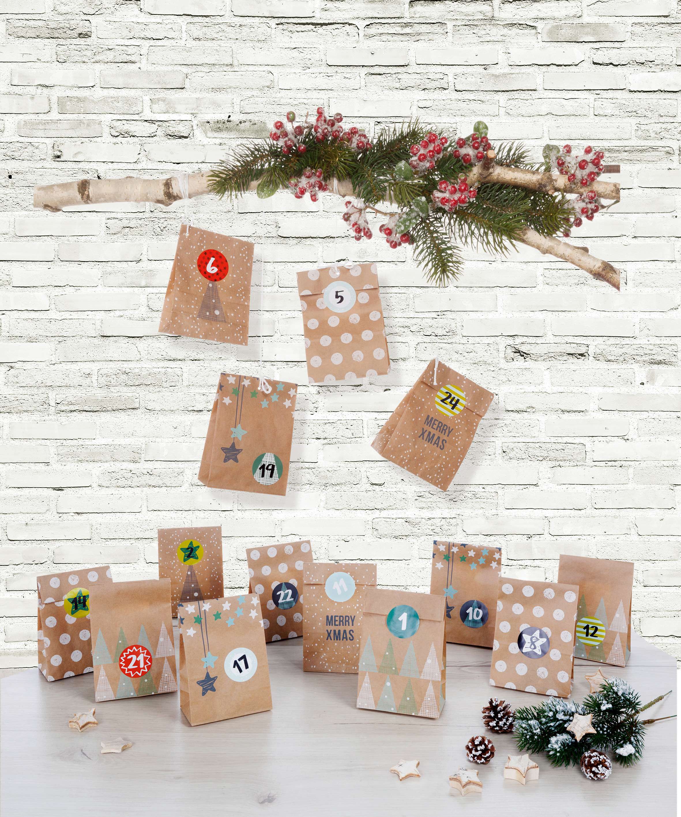 24 lebensmittelechte, Tüten mit verschiedenen weihnachtlichen Motiven. Inkl. Adventszahlen zum Aufkleben.