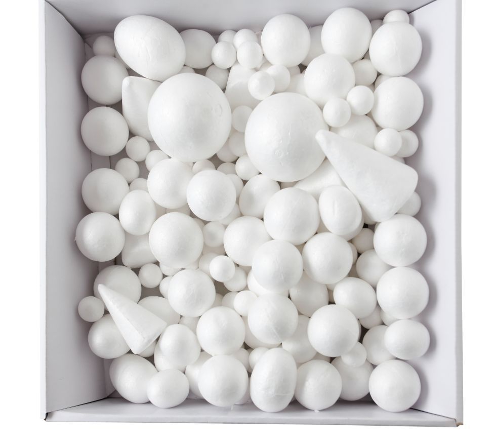 Box mit Kugeln, Kegeln und Eiern in diversen Grössen aus Styropor für Bastel- und Dekoarbeiten, weiss