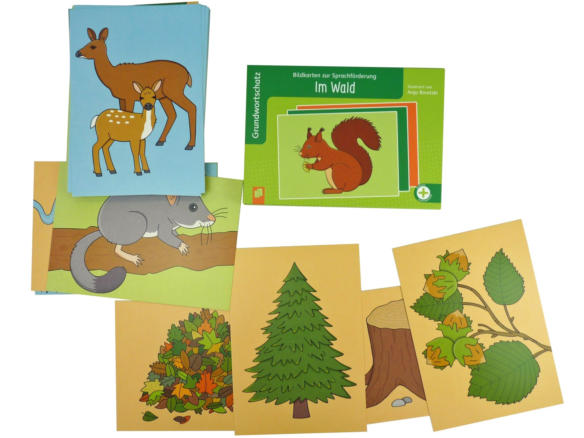 Bildkarten zum Grundwortschatz für Kita, Grundschule und DaZ, geeignet für Kinder ab 1 Jahr +++Igel, Eule, Kastanie - mit diesen 32 klaren Bildkartenmotiven üben die Kinder spielerisch, aber ganz gezielt die Bezeichnung von Tieren und Pflanzen, die sie aus dem heimischen Wald kennen. Die vielfältigen Kartenmotive aus der Tier- und Pflanzenwelt lassen sich nicht nur benennen, sondern auch nach unterschiedlichen Merkmalen sortieren, wie z. B. "lebt am Wegesrand" oder "lebt in der Baumkrone". Ob einzeln, zu zweit oder in der ganzen Gruppe - zahlreiche Spielideen ermöglichen einen abwechslungsreichen Einsatz der Bildkarten. Ideal zum Aufbau des Grundwortschatzes und zur Sprachförderung mit Bildkarten im Kindergarten, von Kindern unter drei und im DaZ-Bereich. Inkl. Bildkarten als Malvorlagen und weiterführenden Tipps zum Download.