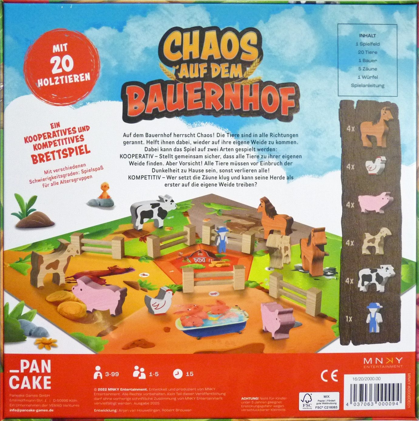 Auf dem Bauernhof herrscht das reinste Chaos! Die Tiere haben sich überallhin verirrt. Jetzt liegt es an dir, sie alle wieder auf ihre eigenen Koppeln zu bringen. Du kannst dieses Spiel auf zwei Arten spielen: KOOPERATIV / MITEINANDER - Sorge dafür, dass die Tiere auf ihre eigenen Koppeln zurückkehren. Aber pass auf! Alle Tiere müssen vor Einbruch der Dunkelheit zurück sein, sonst haben alle verloren! KOMPETITIV / GEGENEINANDER - Stelle dich deinen Mitspielern in den Weg, indem du ihre Koppel blockierst. Wirst du der Erste sein, der sein Vieh in die eigene Koppel treibt?