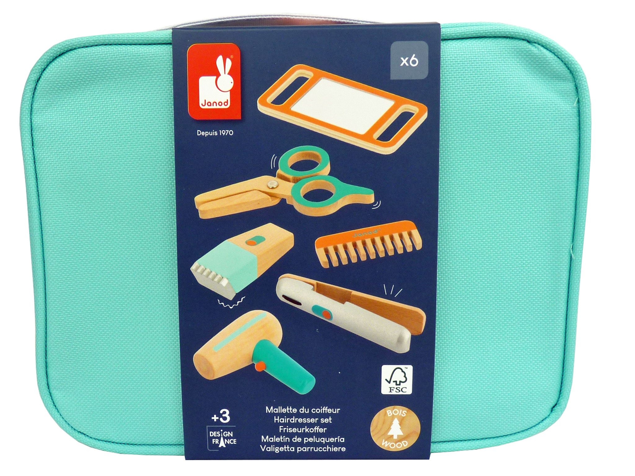 Dieser stilvolle Friseurkoffer ist perfekt für kleine Stylistinnen und Stylisten! Er enthält alles, was man für den ersten Haarschnitt braucht: Glätteisen, Kamm, Schere, Spiegel, Föhn und Rasierer – insgesamt 6 liebevoll gestaltete Utensilien. Nach dem Spielen lassen sich alle Teile ordentlich im handlichen Koffer mit Stoffgriffen verstauen. Ein tolles Rollenspiel-Spielzeug, das die Fantasie anregt und kreatives Spiel fördert. Hergestellt aus FSC™-zertifiziertem Holz und mit Farben auf Wasserbasis bemalt. Ideal für Kinder ab 3 Jahren.