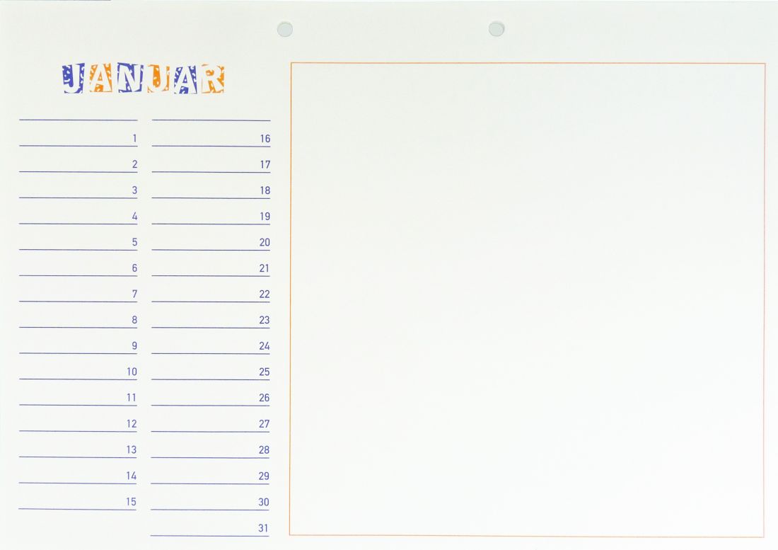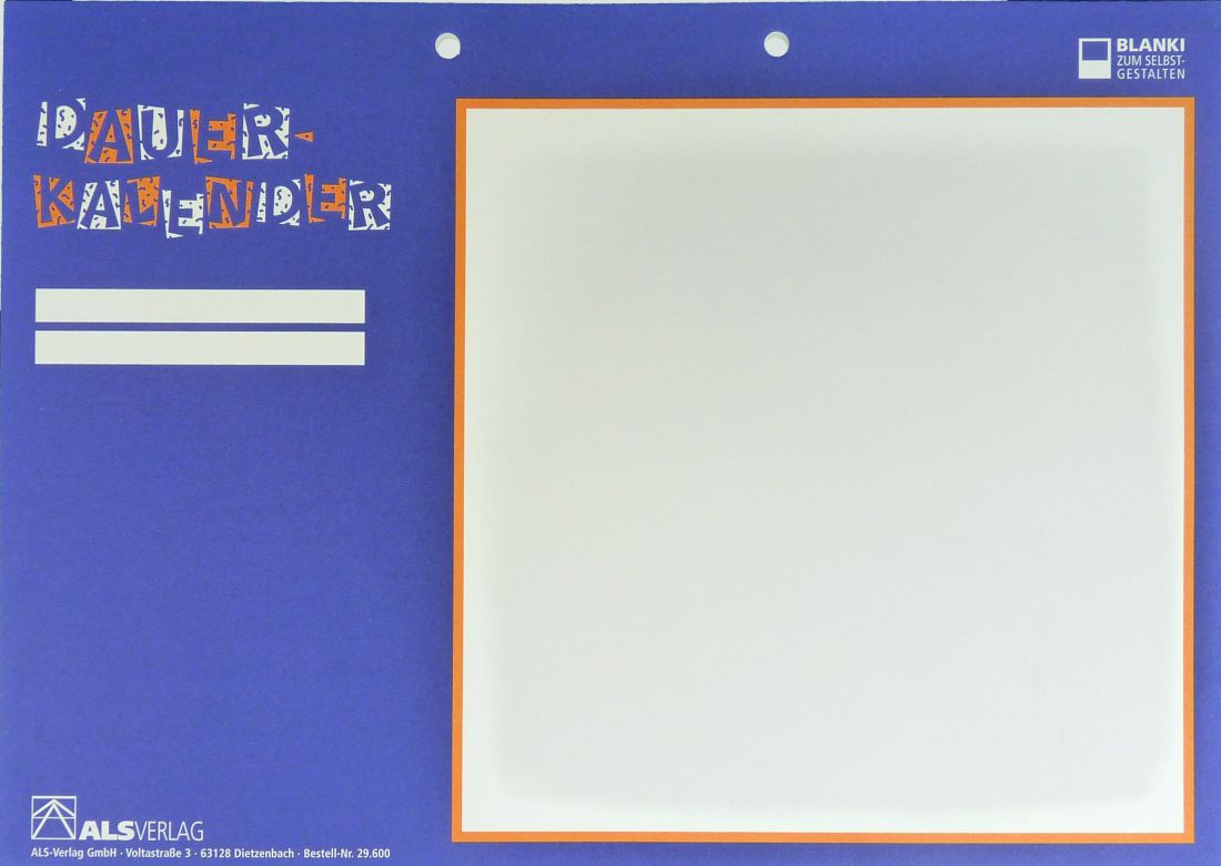 Kalender mit 12 Monatsblättern und 1 Titelblatt, aus weissem Karton 190 g/m2, Format A4 quer, Druck zweifarbig, immer gültiges Kalendarium, Gestaltungsfläche 18x18 cm.