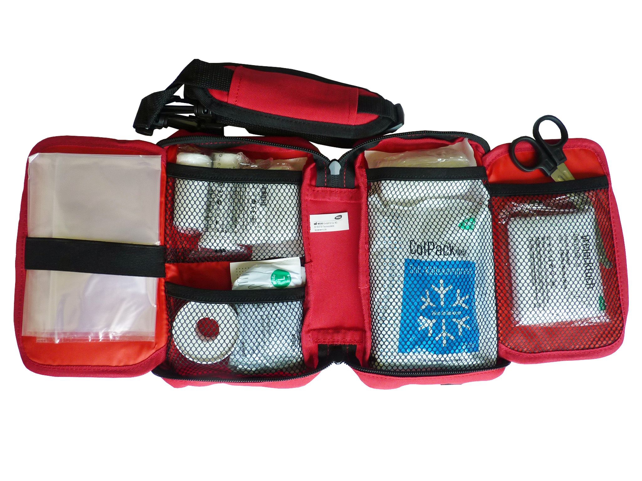 Praktisches Mitnahmeset für Schulen, KiTas und Spielgruppen. Leicht zu öffnen dank Rundum-Reissverschluss und übersichtlich sortiert - Übersichtlicher mit Netzfächern bestückter Innenbereich - 2 zusätzliche klappbare Seitenflügel mit Fächern - inkl. Schultergurt mit Polster - Wasserabweisend - Material: Nylon - Farbe: rot - Inhalt: 2 x Kompresse, steril, 10x10cm - 2 x elastische Fixierbinde 4mx6cm - 1 x elastische Fixierbinde 4mx8cm - 1 x Verbandpäckchen, steriel, Kompresse: 6x8cm - 1 x Verbandpäckchen, steriel, Kompresse 8x10cm - 1 x Dreiecktuch - 1 x Pflastersortiment - 1 x Spulenpflaster 5mx2,5cm - 1 x Sofort-Kältekompresse - 2 Paar Vinyl-Infektionsschutzhandschuhe - 1 x Rettungsdecke - 1 x Universalschere - 5 x Wund- und Hautreinigungstuch - 1 x Folienbeutel mit Druckverschluss - 1 x Erste-Hilfe-Anleitung