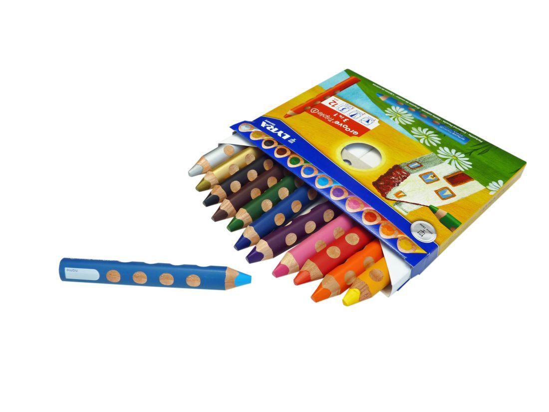 Aquarellstift, Farbstift und Wachsmalkreide in einem Stift. Hohe Farbbrillanz, weicher Abstrich, aussergewöhnliche Deckkraft, wasservermalbar. Extra dicke Miene, Durchmesser 10mm - Ergonomische, natürliche Griffzone und rutschfeste Griffmulden für Daumen- Zeige- und Mittelfinger im Versatz, zur Unterstützung der optimalen Schreibhaltung.Farben: Zitronengelb, Orange, Geranium Hell, Purpurrosa, Karmoisin, Lichtblau, Preißischblau, Permanentgrün, Braun, Schwarz, Gold, Silber.