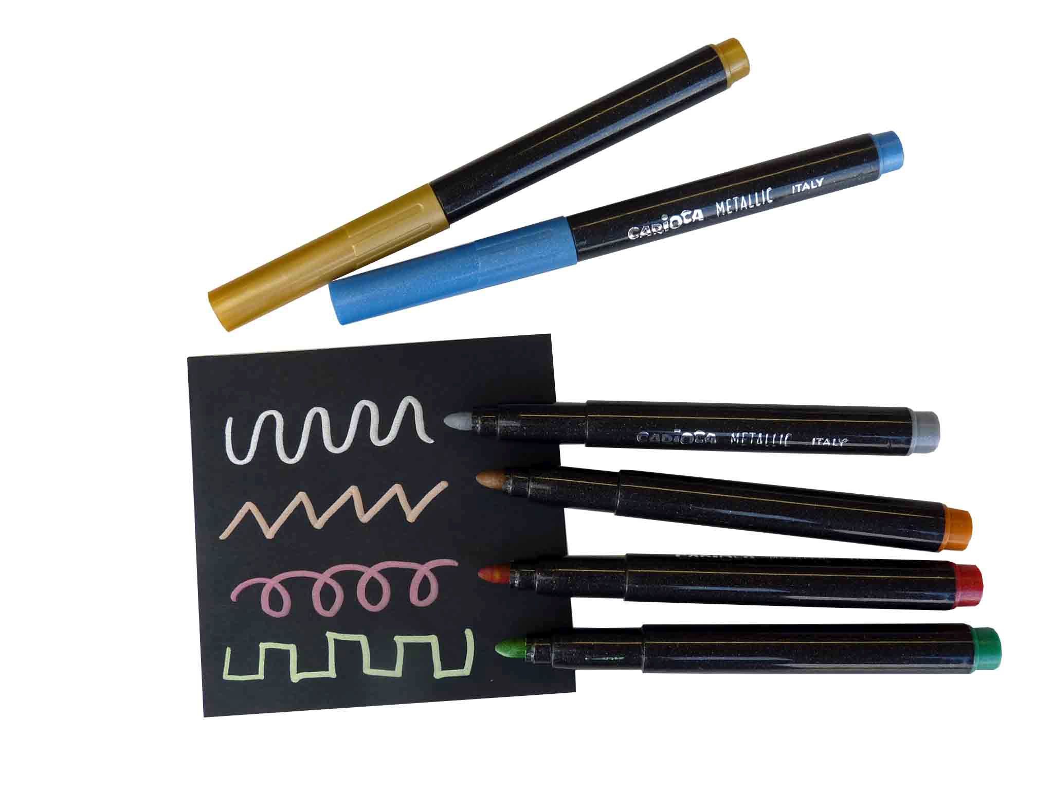 Diese Fasermaler metallic malen auch auf dunklen Oberflächen in einem satten Farbauftrag und hoher Leuchtkraft. Die Farben haften auch auf Glas, Metall oder Plastik, sind von dort auch wieder ablösbar. Permanente Haftung auf porösen Materialien wie Papier, Karton, Holz,... Breite, weiche Rundspitze. Strichstärke: 4 -6mm