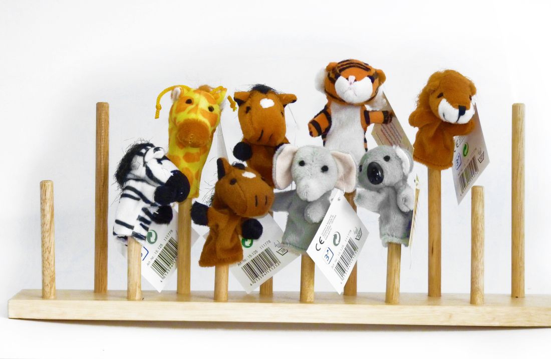 Süsse Fingertiere aus flauschigem Plüsch. je Elefant, Tiger, Giraffe, Zebra, Löwe und 2 Pferde Praktisch dazu der Holzständer Art.Nr. 160-79.