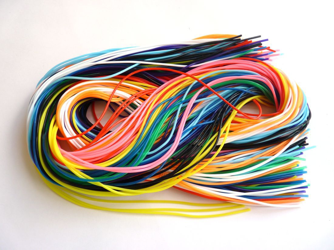 100 Flechtschnüre aus Plastik, Ø 1,8 mm, 1 m lang. Je 50 Schnüre in opaken und transparenten Farben (rosa, violett, hellblau, dunkelblau, orange, grün, rot, schwarz, weiss, gelb).