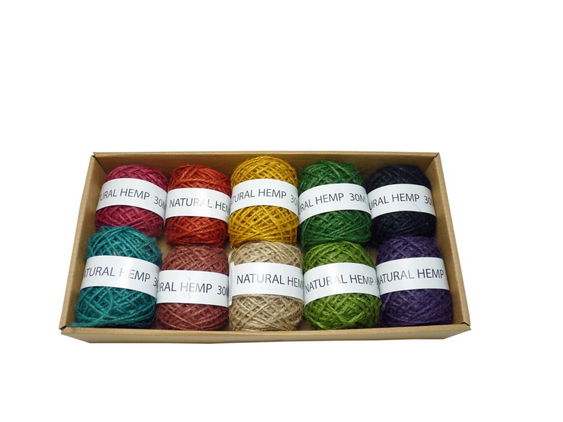 Sortiment an 10 natürlichen Farben à je 30m. Gelb, Natur, Rot, Rostrot, Braun, Hellgrün, Dunkelgrün, Blau, Violett und Schwarz.