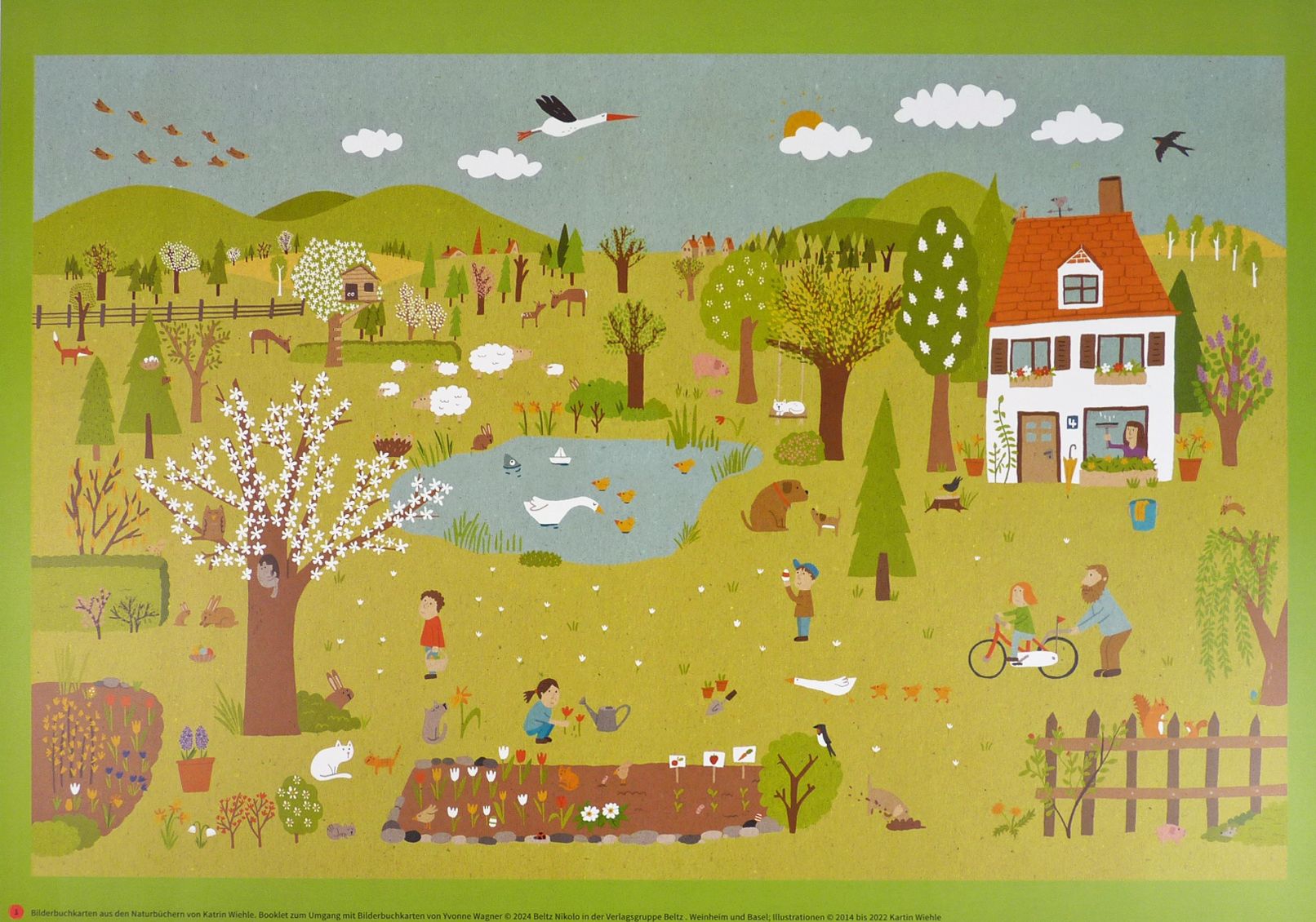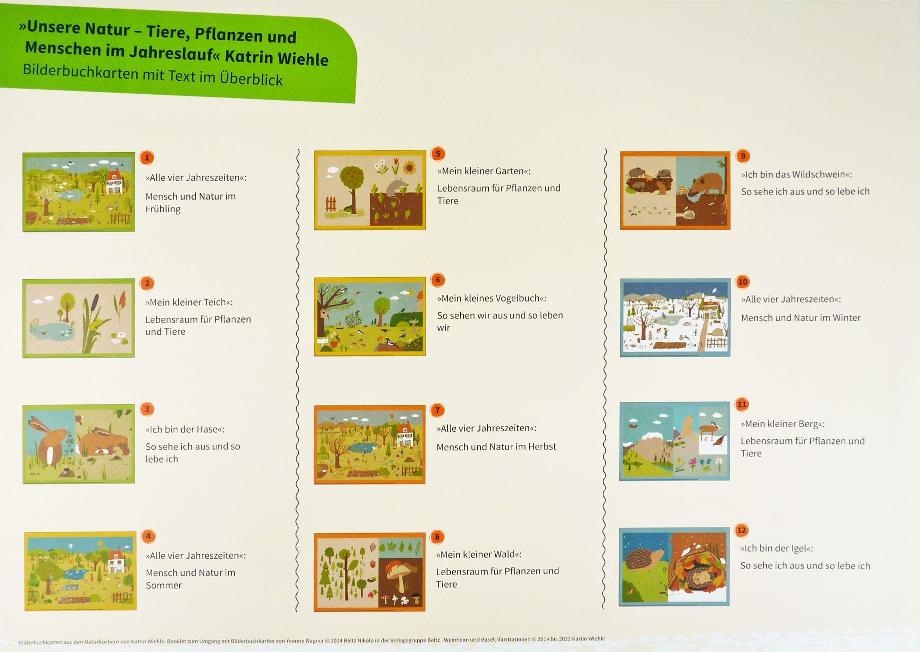 Egal ob Frühling, Sommer, Herbst oder Winter, egal ob Ostern, Weihnachten, Blätterkunde, Vogelarten, Wildschwein, Igel, Wald, Teich oder Berg - dieses Kamishibai bietet pädagogischen Fachkräften in Kita und Grundschule das ganze Jahr vielfältige Einsatzmöglichkeiten. Katrin Wiehles Art, Kindern die Natur zu zeigen, begeistert immer wieder aufs Neue. Mit warmherzigen und klaren Illustrationen weckt sie Interesse an Tieren und ihren Lebensräumen und erklärt gut verständlich erste ökologische Zusammenhänge. Das pädagogische Begleitmaterial umfasst Grundlagenwissen und Praxisideen zu folgenden Themen: Mensch und Natur im Jahreslauf, Umweltschutz, Natur vor der Haustür, Feste und Feiertage, die vier Jahreszeiten, verschiedene Lebensräume mit ihren Pflanzen und Tieren (Teich, Garten, Wald, Berg).Die vielfältigen Praxisideen zu jeder Bilderbuchkarte regen die Kinder zum Gestalten, Nachfragen, Entdecken, Experimentieren und Spielen an.