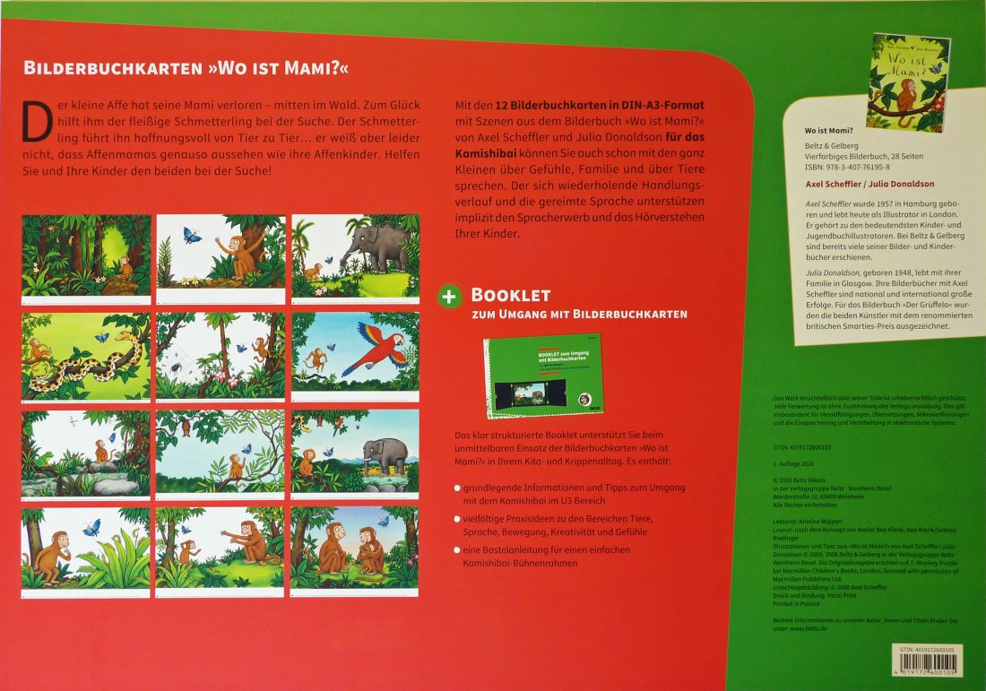 Der beliebte kleine Affe von Axel Scheffler und Julia Donaldson hat seine Mami verloren. Doch zum Glück hilft ihm der Schmetterling bei der Suche. Mit diesen Kamishibai-Karten geht es für die U3-Kinder auf eine Reise quer durch den Wald. Die großformatigen Bilderbuchkarten zu »Wo ist Mami?« sprechen die ganz Kleinen direkt an - eine bunte und freundliche Tierwelt mit starken Farben und klaren Formen. Ganz intuitiv fühlen sich die Kinder in die Gefühlswelt des kleinen Affen ein, denn Situationen, in denen man von der eigenen Mama getrennt ist, kennen sie nur zu gut. Bis zum ersehnten Happy End fiebern die Kinder mit und können sich dann am Ende umso mehr mit dem kleinen Affen freuen! Auch Kinder mit noch geringen Deutschkenntnissen können dieser Geschichte durch den immer wiederkehrenden Handlungsablauf und den klaren Bildern gut folgen. Das dazugehörige Booklet bietet frühpädagogischen Fachkräften fundiertes Fachwissen und praktische Tipps zum Einsatz des Kamishibais im U3-Bereich. Folgende Themen werden im Booklet behandelt: - der Einsatz des Kamishibais im U3-Bereich - Familie, Bindung und Beziehung - Sprachgefühl und Phonologische Bewusstheit