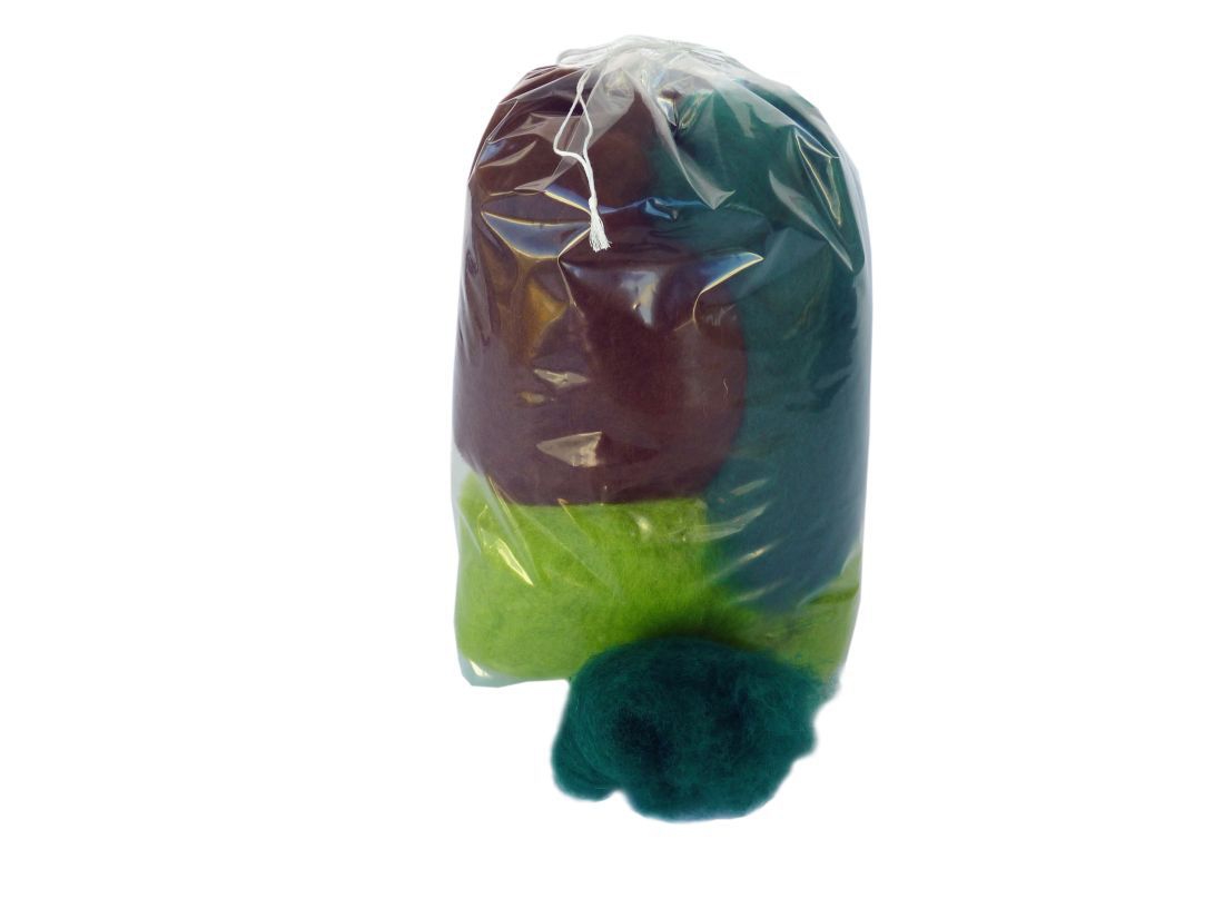 Kombination von Hellgrün, Dunkelgrün und Braun. Insgesamt 100g. Zum filzen und basteln.