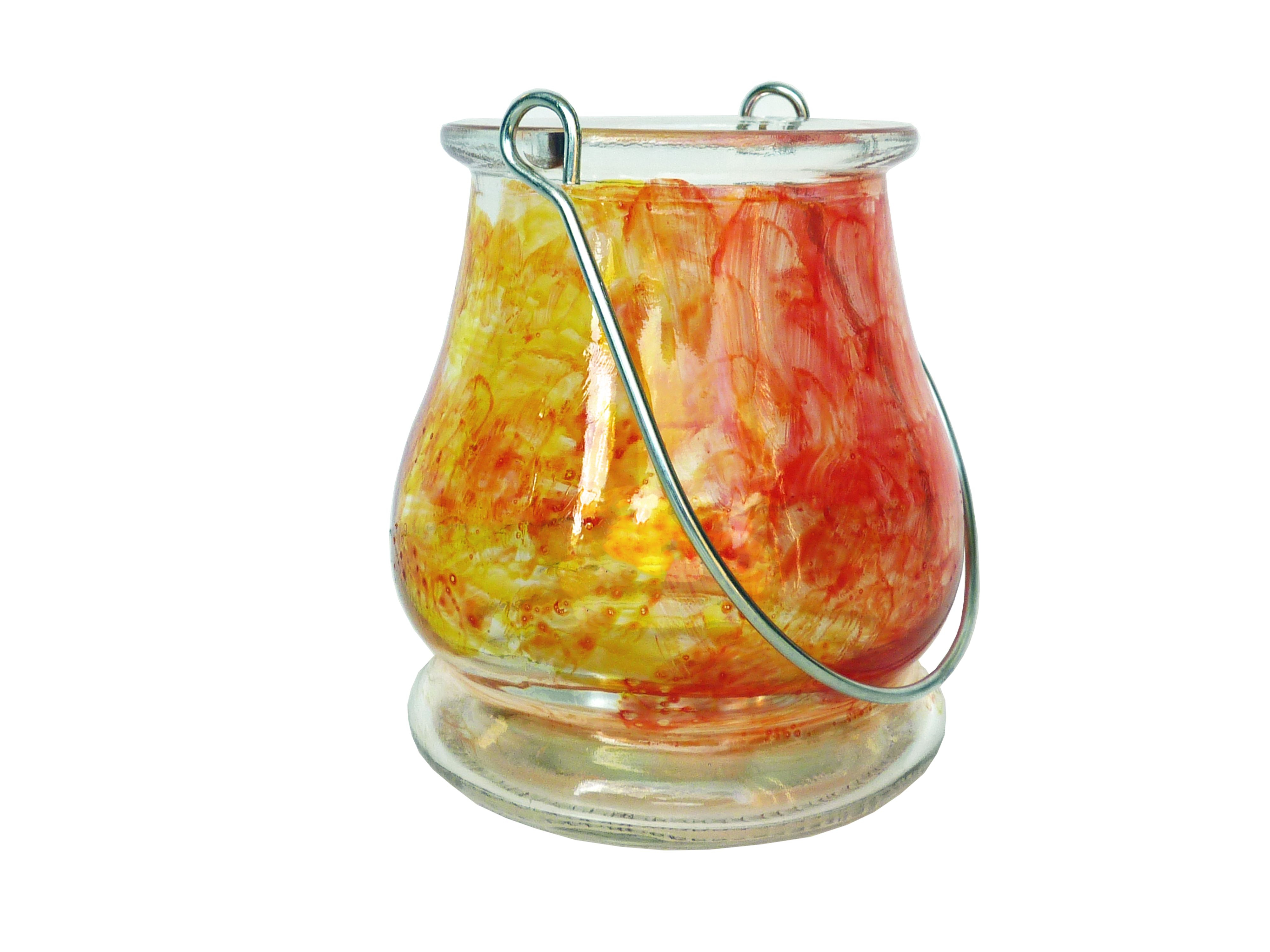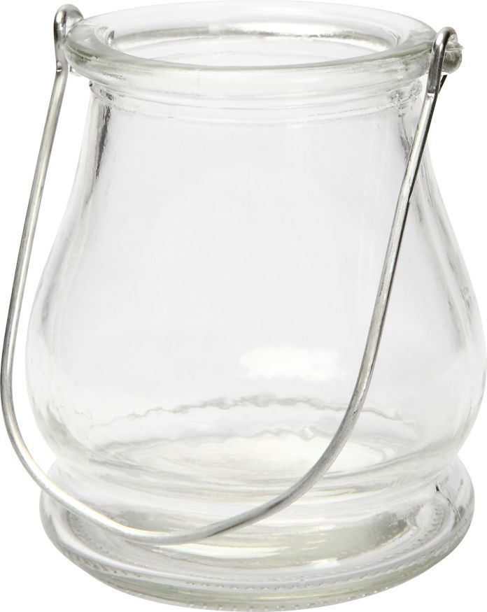 bauchiges Glas mit Metallbügel, Höhe 95mm, Ø 68mm. Kann mit Glas- und Porzellanfarben bemalt werden.