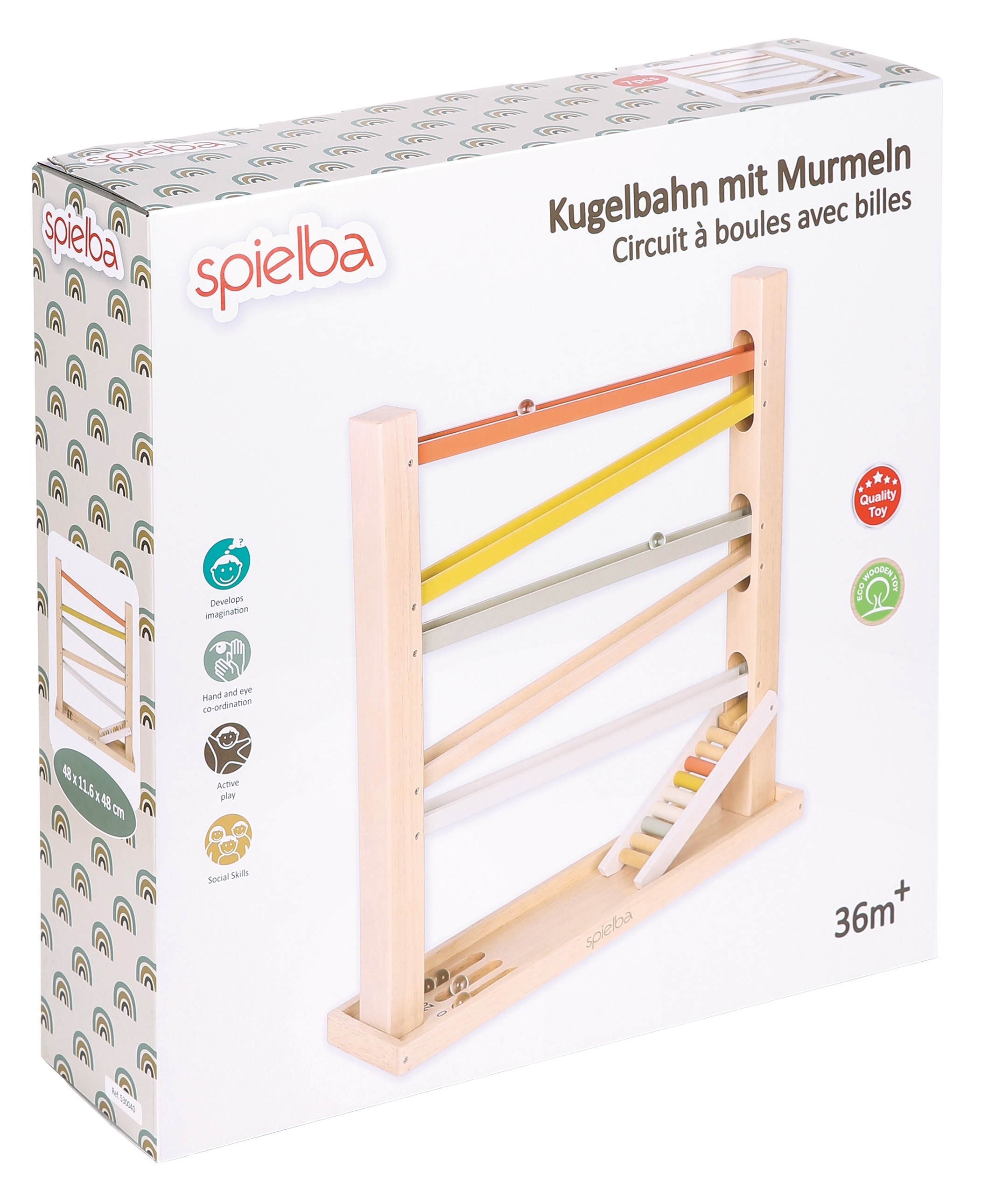 Klassische Kugelbahn in modernen Farben, hergestellt aus 100% FSC-zertifiziertem Holz. Die Kugelbahn hilft bei der Entwicklung der Hand-Augen-Koordination und der Feinmotorik. Inklusive 6 Murmeln.