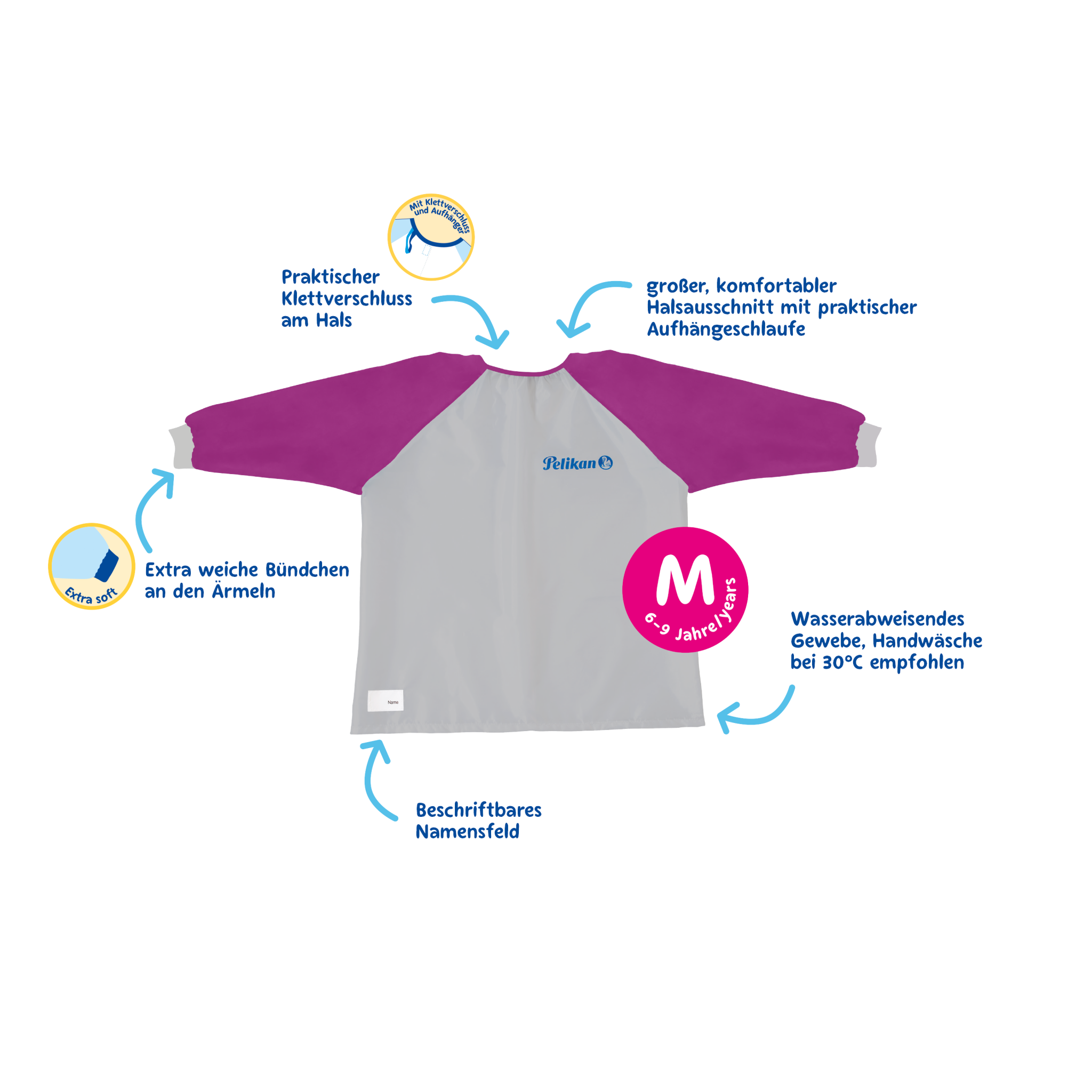 Kinder-Malschürze, 100% Polyester. Mit Klettverschluss, einfach anzuziehen, One size 6-9 Jahre, Waschbar: 30Grad. Beschriftbares Namensschild, mit praktischem Tragbeutel