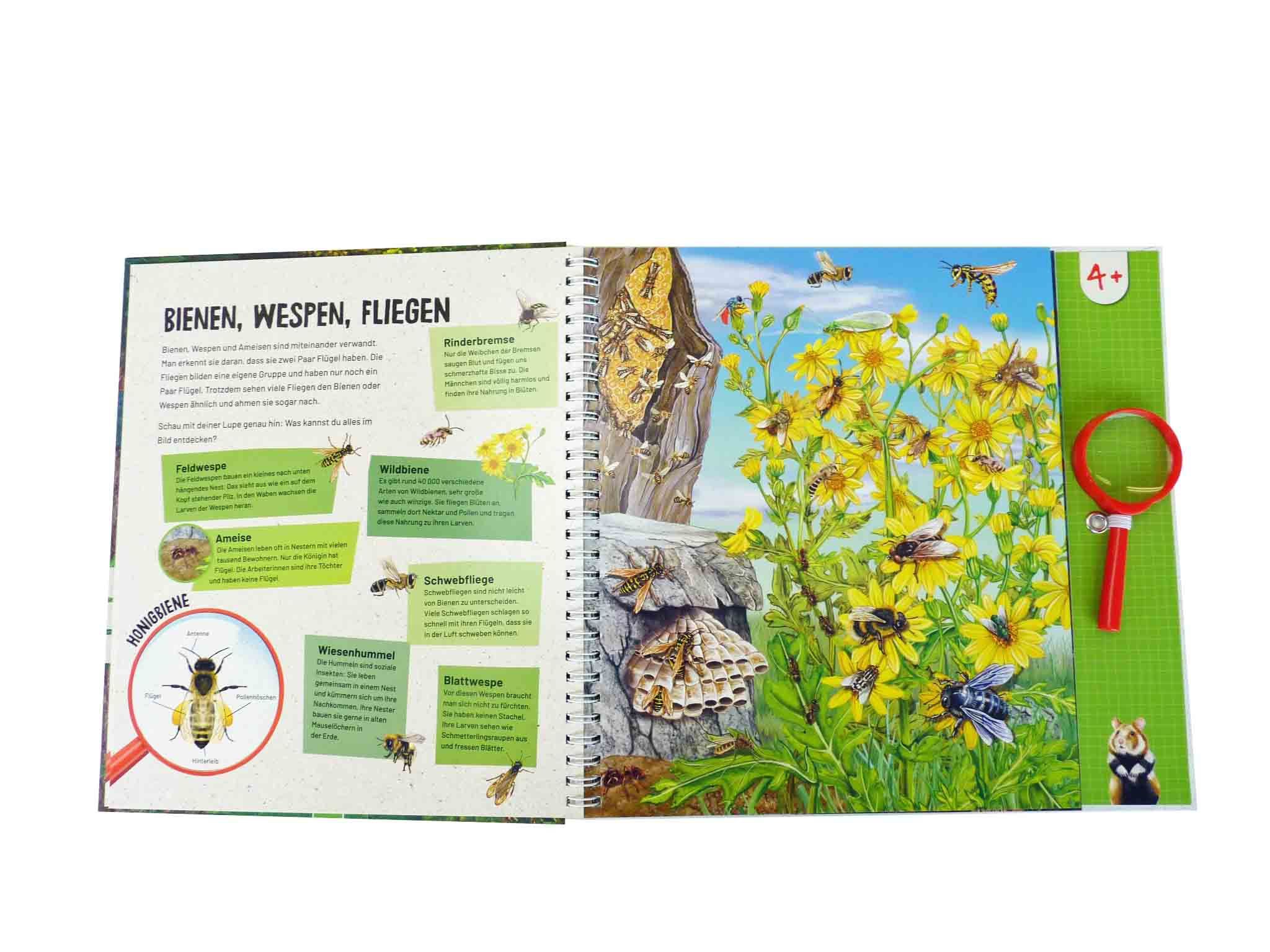 Lerne mehr über deine Umwelt, die Natur und die darin lebenden Tiere und Pflanzen. Auf jeder Seite gibt es neue und spannende Infos über die verschiedensten Pflanzen- und Tierarten und ihren Lebensräumen. Mit der praktischen Lupe kannst du noch genauer hinschauen: Betrachte Insekten, Blumen und Co. in voller Größe und lerne ihren Aufbau genau kennen. Schau dich selbst in der Natur um: Findest du vielleicht noch mehr Tier- und Pflanzenarten im Wald und auf der Wiese? Am Ende des Buchs erwartet dich außerdem ein kniffliges Quiz, mit dem du dein neu erlangtes Wissen auf die Probe stellen kannst. Jetzt zeigt sich: Hast du auch wirklich genau hingeschaut?
