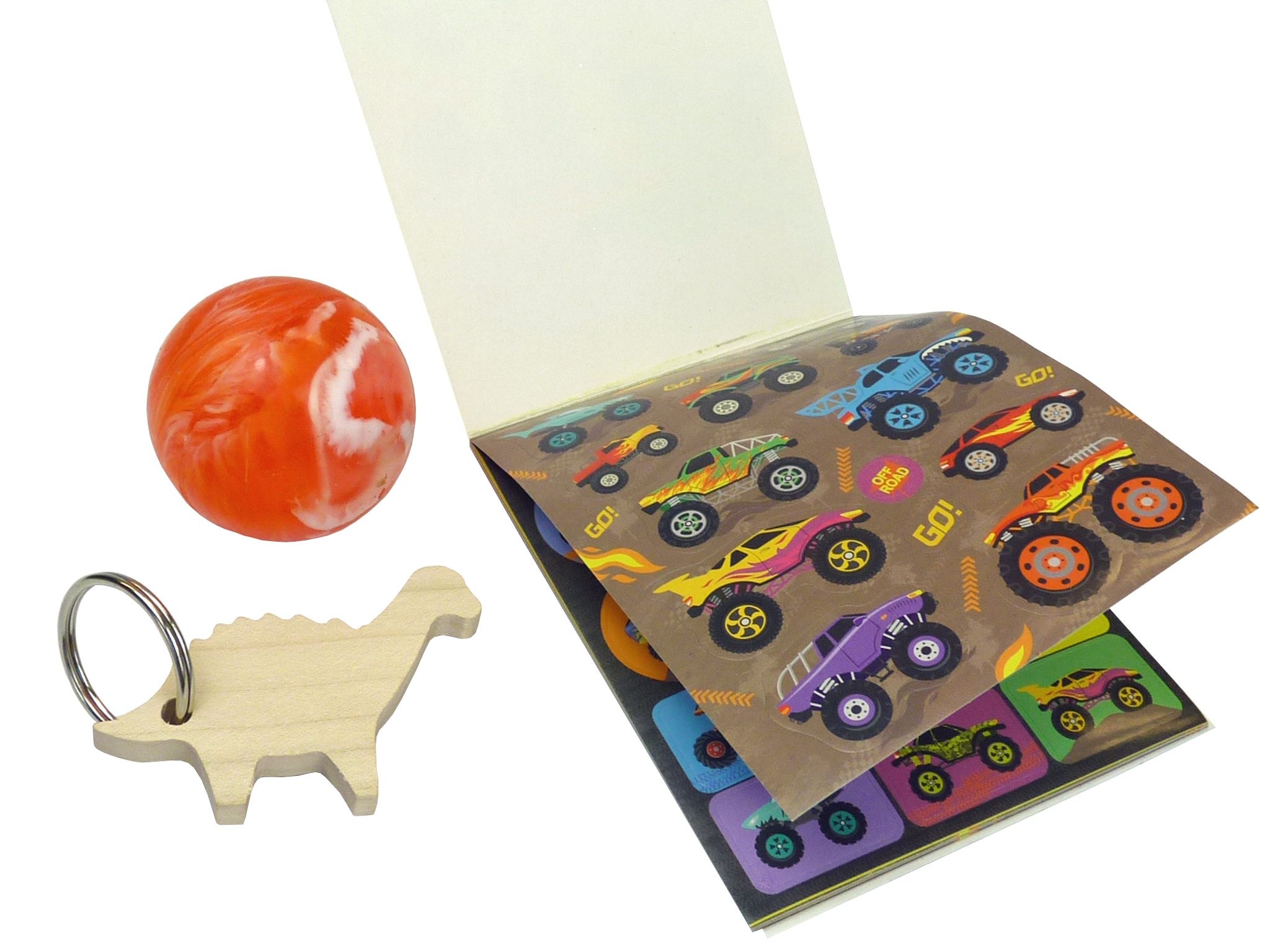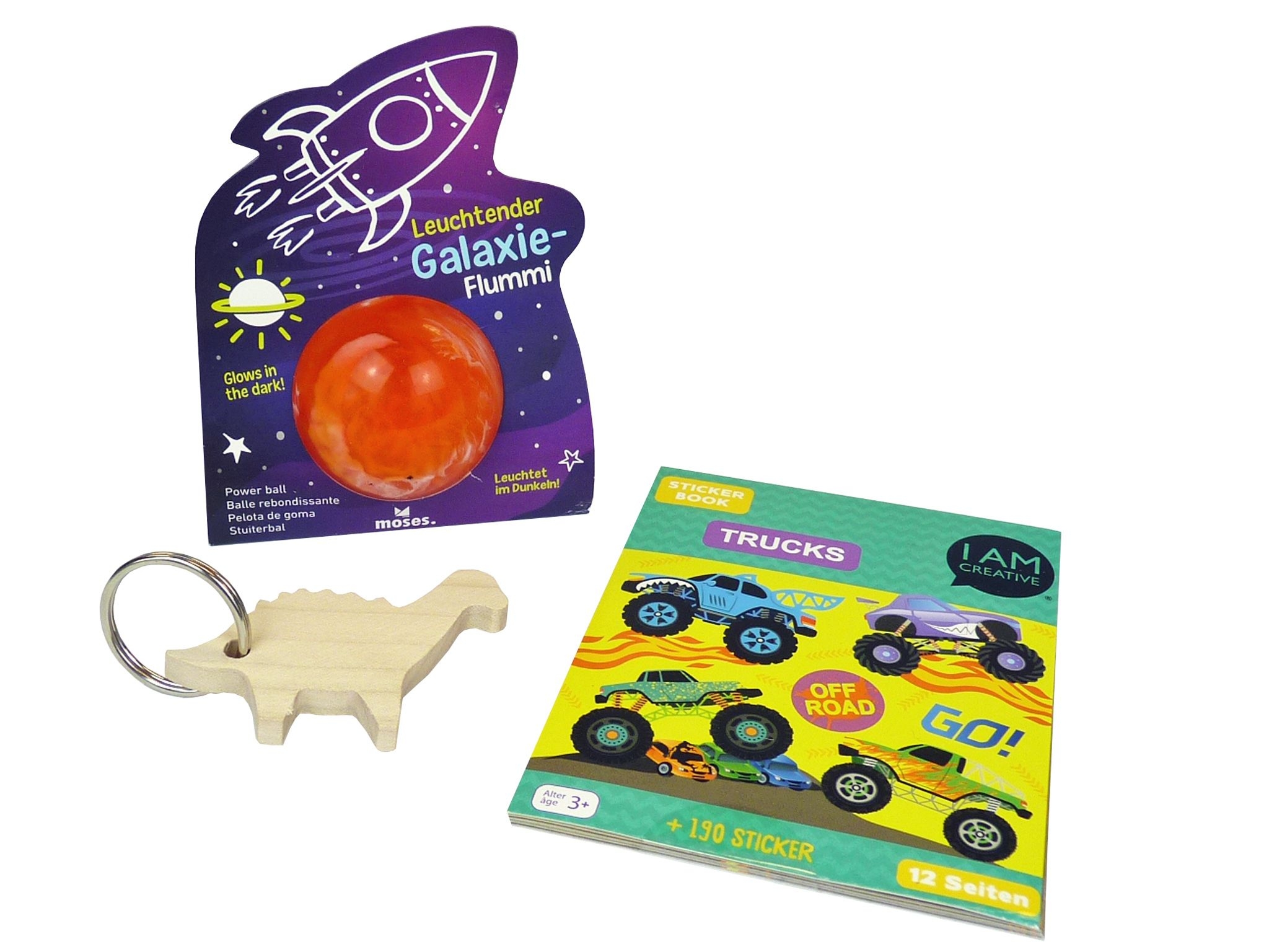 Entdecke das ultimative Abenteuer mit dem Mitringsel Draufgänger Set! Dieses spannende Paket enthält ein StickerSet mit coolen Trucks, einen Schlüsselanhänger in Form eines Dino aus Holz und einen faszinierenden Galaxie-Flummi-Gummiball. Perfekt für kleine Entdecker, die Spass an kreativem Spiel und aufregenden Abenteuern haben! Inhalt: 1 x Sticker-Set Mini Trucks 1 x Gummiball Galaxie Flummi 1 x Schlüsselanhänger Dinosaurier