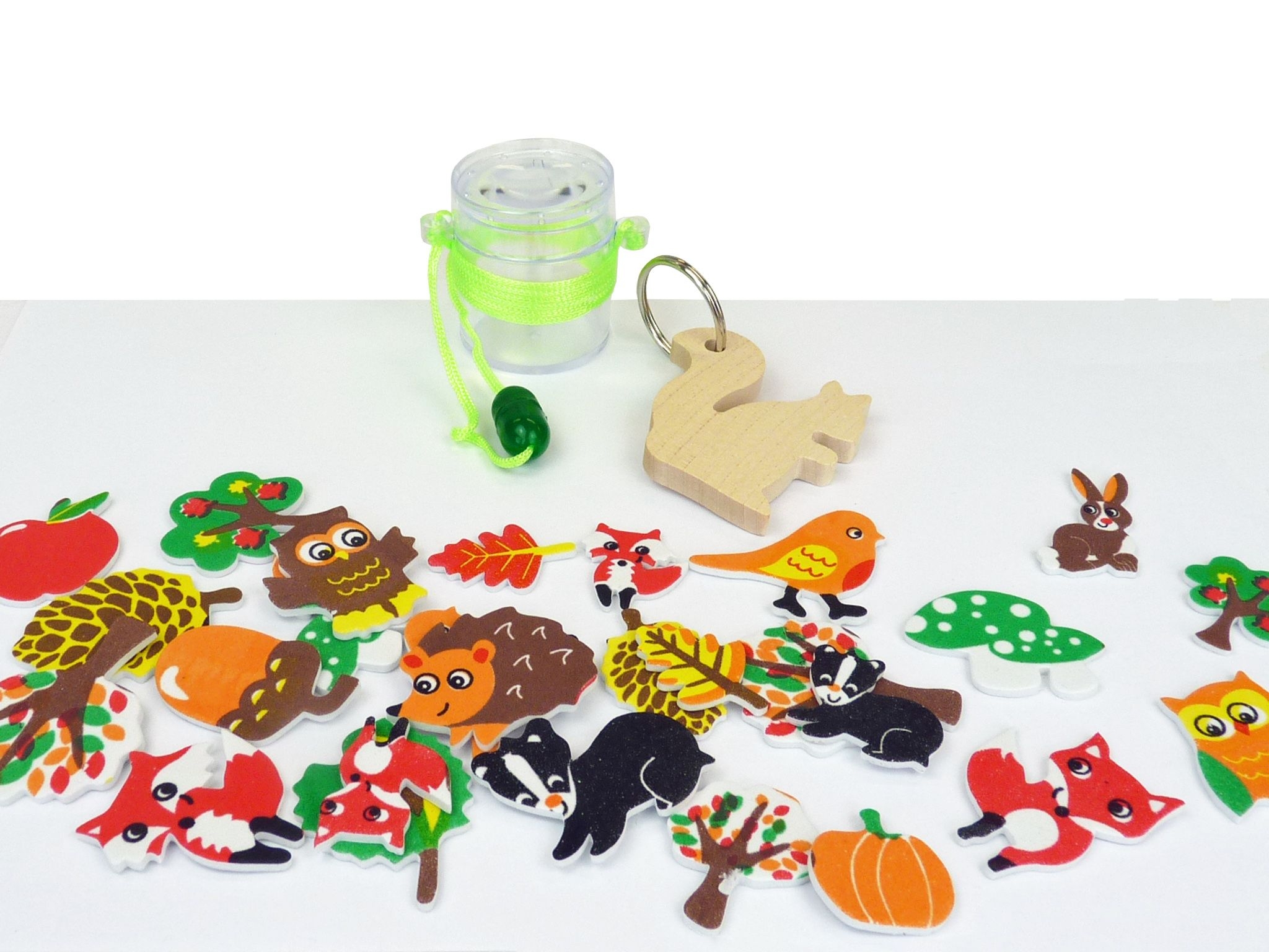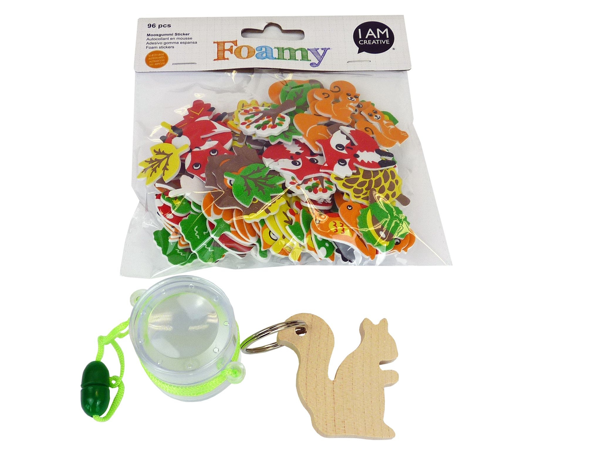 Entdecker Sparset – perfekt für kleine Naturfreunde! Enthalten sind bunte Moosgummi Sticker mit Waldmotiven, eine praktische Lupendose mini zum genaueren Beobachten von Insekten und Pflanzen, sowie ein niedlicher Schlüsselanhänger in Holzform eines Eichhörnchens. Ideal für kreative Abenteuer im Freien und als Mitbringsel für Entdeckungsfreudige! Inhalt: 1 x Lupendose Mini (40-201) 1 x Moosgummi Forest selbstklebendb (18-288) 1 x Schlüsselanhänger Eichhörnchen (15-205.M33)