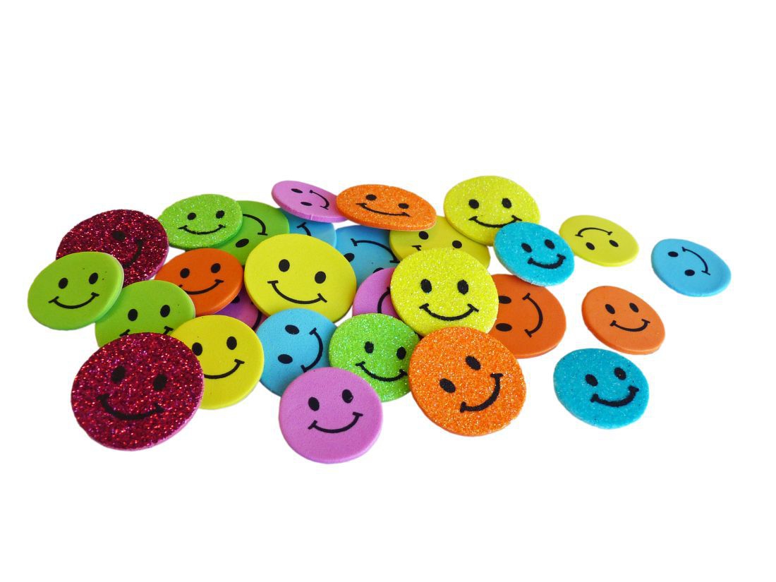 30 Moosgummi Sticker "Smile" in verschiedenen Farben und Größen - selbstklebend - Diese Sticker lassen sich auf Papier, Karton, Plastik etc. kleben. Die Möglichkeiten sind endlos. Inhalt: 10 Stück Ø 3 cm - 10 Stück Ø 2,5 cm - 10 Stück mit Glitzer Ø 3 cm und 2,5 cm.