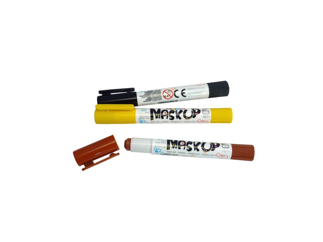 Schminkstifte in den Farben Gelb, Braun und Schwarz.