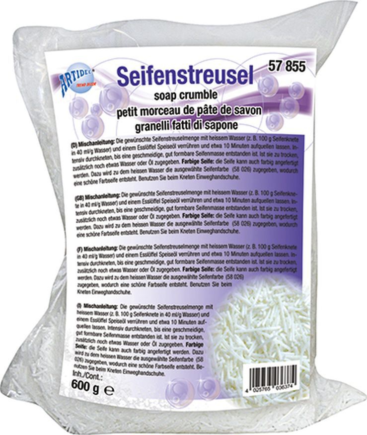 Mit den klein und fein geraspelten Seifenstreuseln lässt sich eine Seifen-Knetmasse herstellen. Mit der Knetmasse formen Sie lustige Seifenfiguren oder Sie walzen den Teig zu einem ca. 8cm dicken Fladen aus und stechen mit Förmchen die Figuren aus. Die Figuren erst nach dem Trocknen, nach ca. 1 Stunde, aus den Förmchen drücken. Die Streusel lassen sich durch Beigabe von Seifenfarben einfärben.
