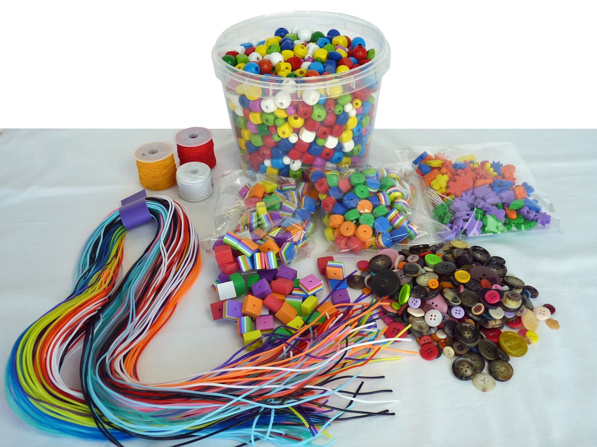 Inhalt: Knöpfe (200g), Holzperleneimer (1,5l), 3 Packungen Moosgummi-Fädelteile (je 100x rund, eckig, Blumen und Sterne), Flechtschnüre (100 Stück), 2 Gummifäden à 25 Meter, Baumwollschnur gewachst (25m)
