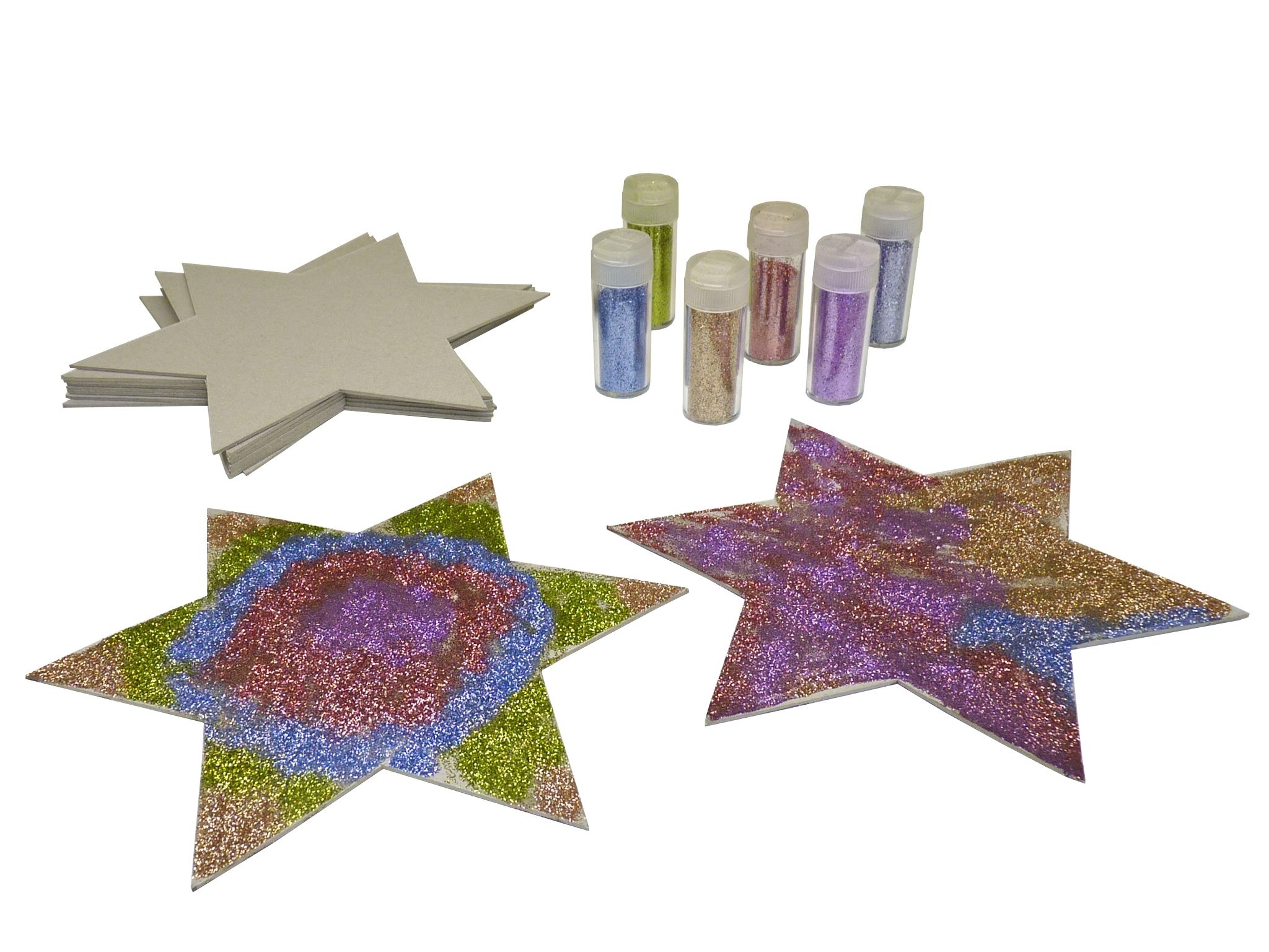 Inhalt: 10 Kartonsterne 20cm, 2 Bastelkleber 100g (mit Applikator), 2x Glitter 6er Set Kartonsterne beidseitig beleimen damit sie sich nicht wölben.