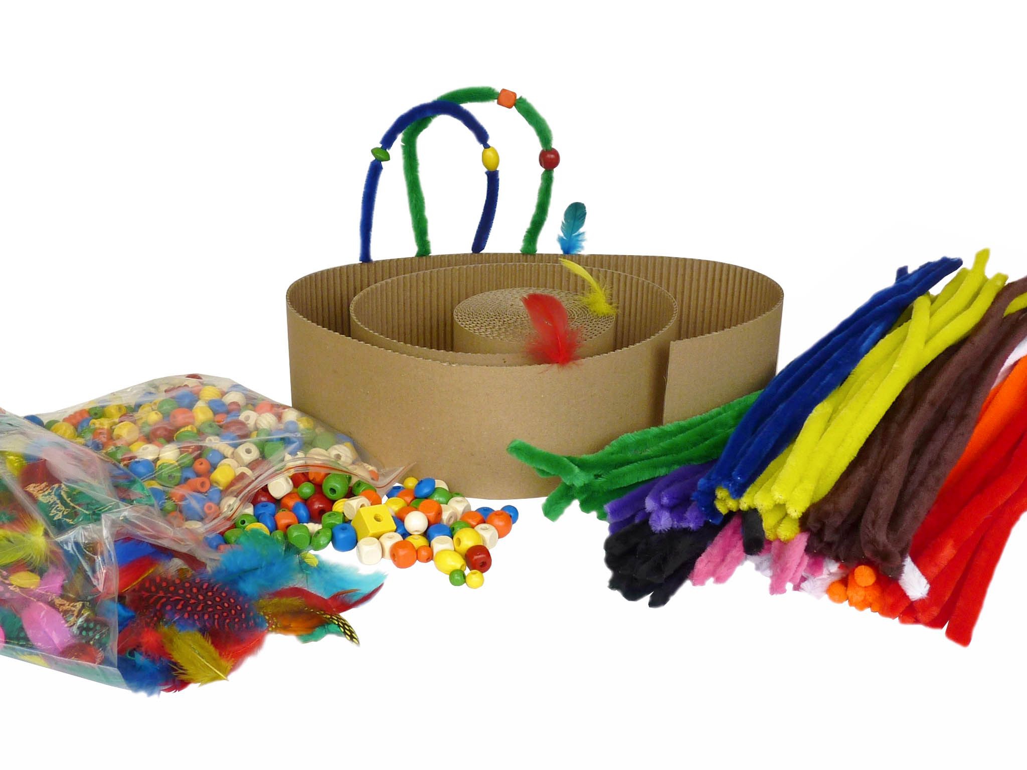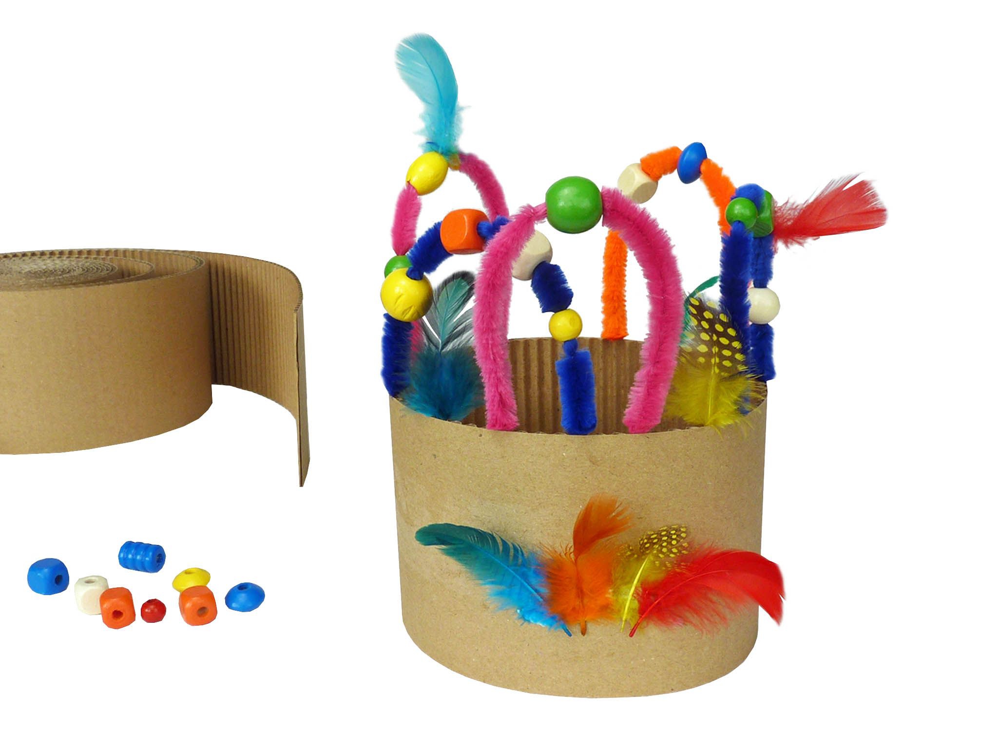 Aus diesem Sparset lassen sich ca 12 Glückskronen basteln. Den Wellkarton auf ca 50cm zuschneiden und zur Krone rollen. Jetzt können Pfeifenputzer, Holzperlen und Federn mit guten Wünschen versehen, und in den Wellkarton gesteckt werden. So kann für jedes Kind eine eigene Glückskrone oder einen Glückskreis für die ganze Gruppe gestaltet weden. Inhalt: 1x Wellkarton für Kronen 6m, 1x Holzperlen 2. Wahl 500g, 1x Federn-Mix, 1x Pfeifenputzer 14mm