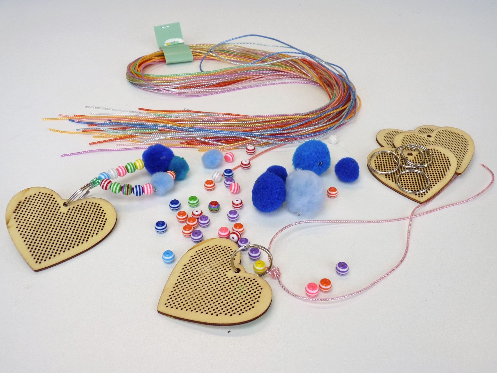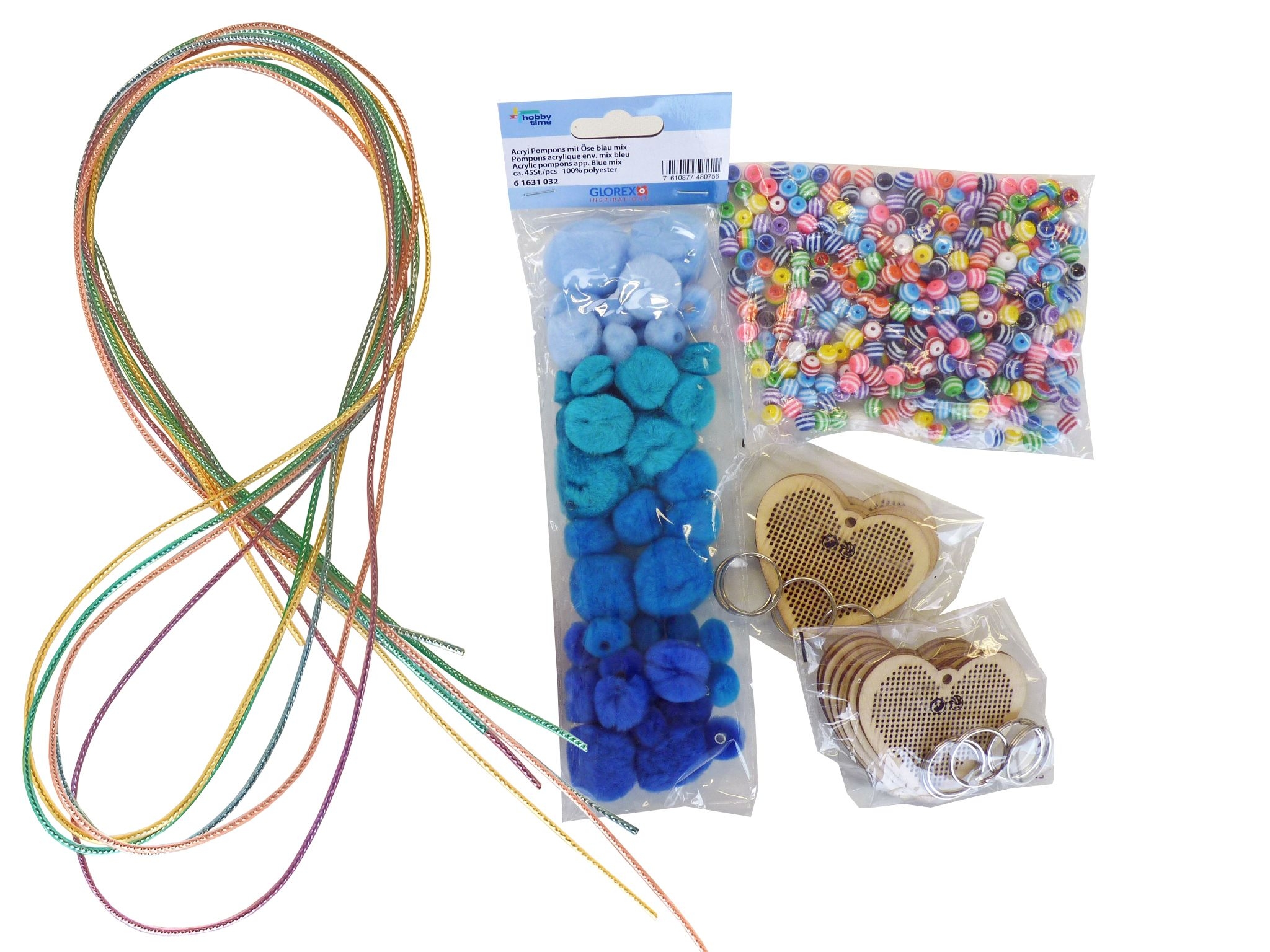 Ein wunderbares Geschenk zum Muttertag. Inhalt: 5x Flechtschnüre glänzend 100cm, 10x Schlüsselanhänger Herz, 1x Perlen gestreift ca 180 Stk., 1x Pompons mit Loch blau-mix 45 Stk.