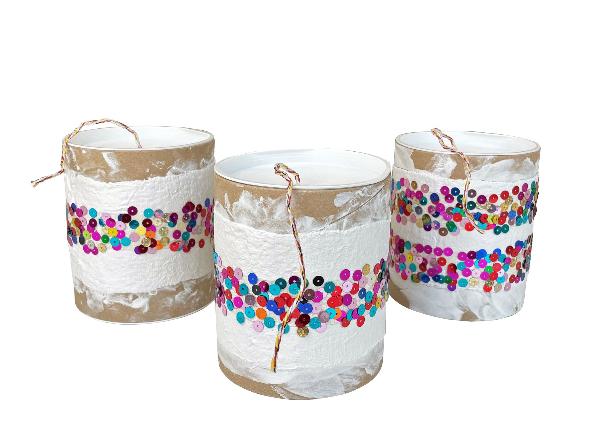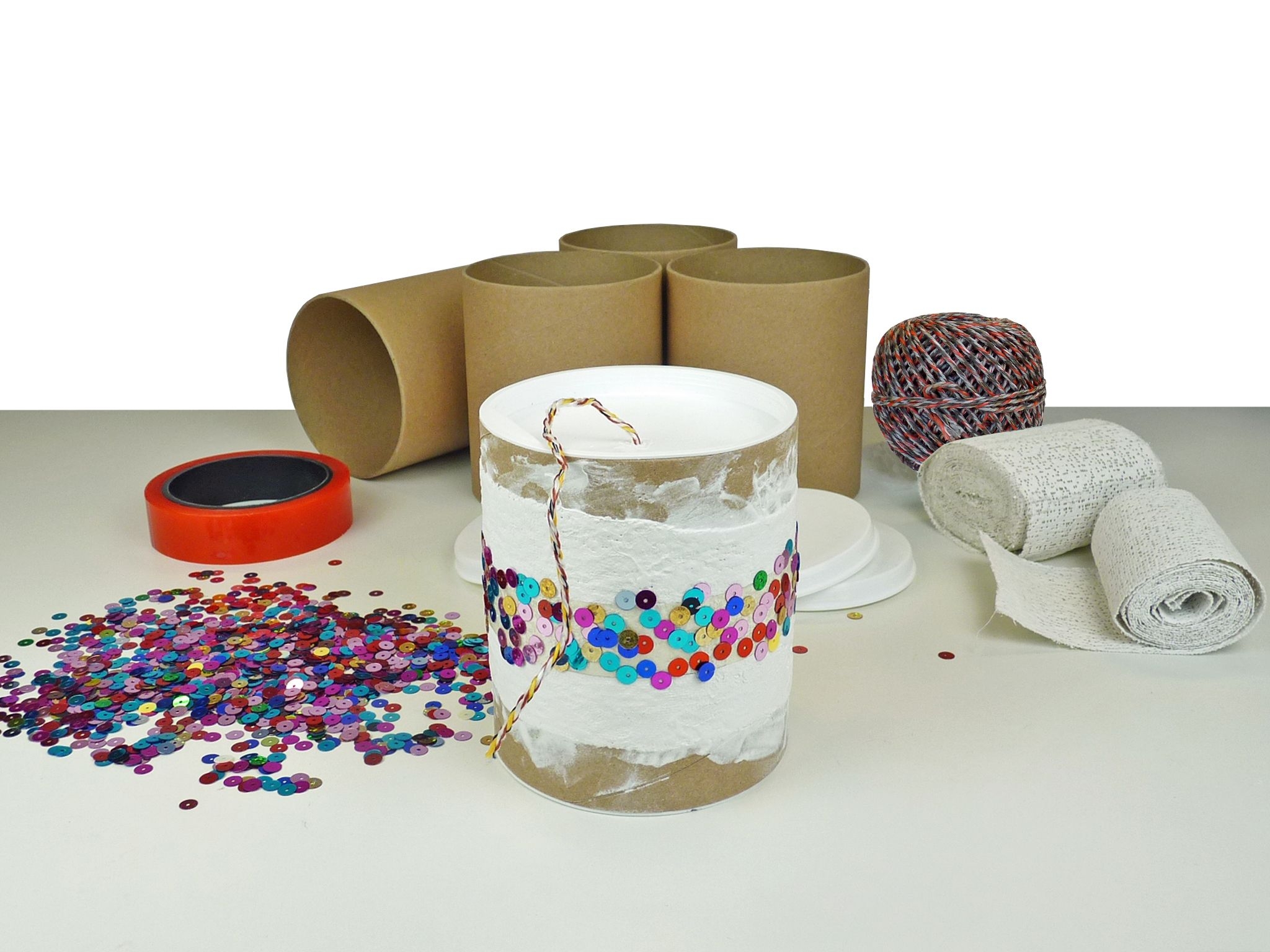 Praktische Schnurdose zum Selbermachen und verschenken. Gibsbinden zuschneiden und kurz ins Wasser einlegen. Die Gibsstreifen um die Dose legen und mit den Fingern den Gibs einmassieren und verstreichen, trocknen lassen. Ein oder zwei Streifen Klebeband über den Gibs um die Dose kleben und die ganze Dose über die ausgestreuten Pailletten rollen. Mit einer Aale oder spitzer Schere ein Loch in den Deckel stechen und die Schnur durchfädeln. Tip: Um den Deckel auf die Dose zu drücken, in der Mitte des Deckels stark draufdrücken. Inhalt: 12x Kartondose mit Deckel Ø10cm, 12x Schnur, 1x Klebeband Doppelseitig, 6 Meter Gibsbinden, 1xPailletten Zip Bag