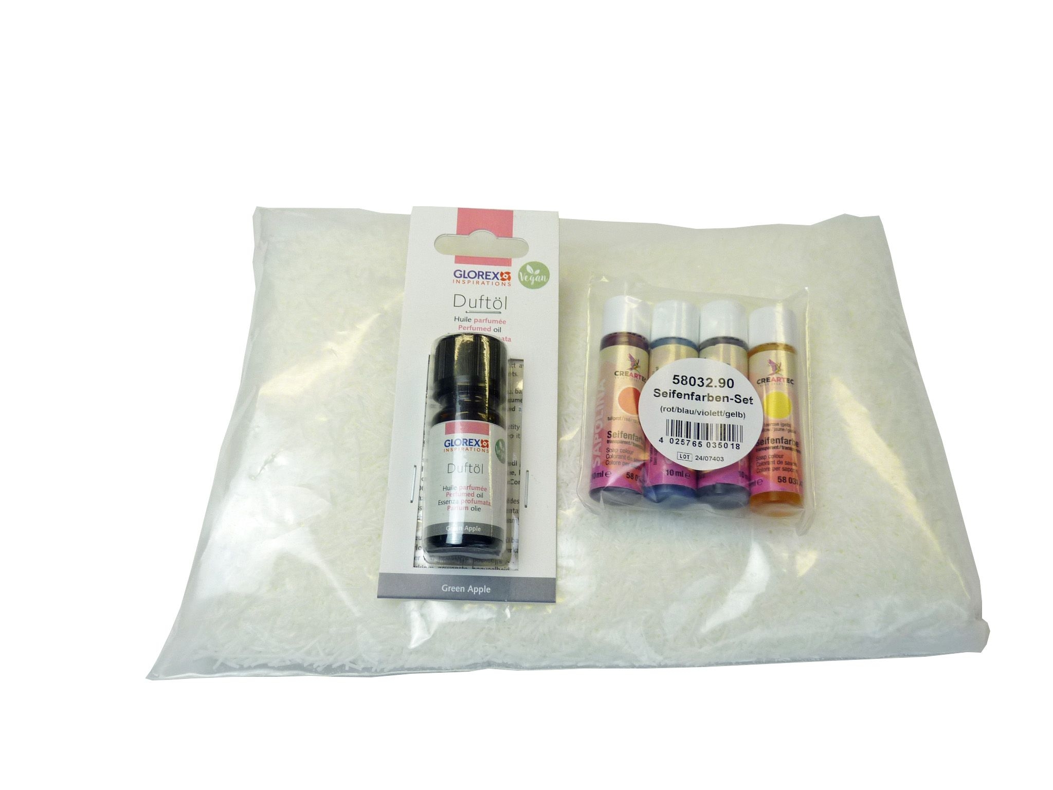 Duftende, bunte Seifen kinderleicht selber herstellen. Zu den Seifenflocken einige Tropfen Duftöl und Farbe dazugeben und mit wenig Wasser mischen. Gut durchkneten und Seifen formen. Inhalt: 1x Seifenstreusel (600g), 1x Duftöl Green Apple (10ml) 1x Seifenfarben-Set 4 Farben