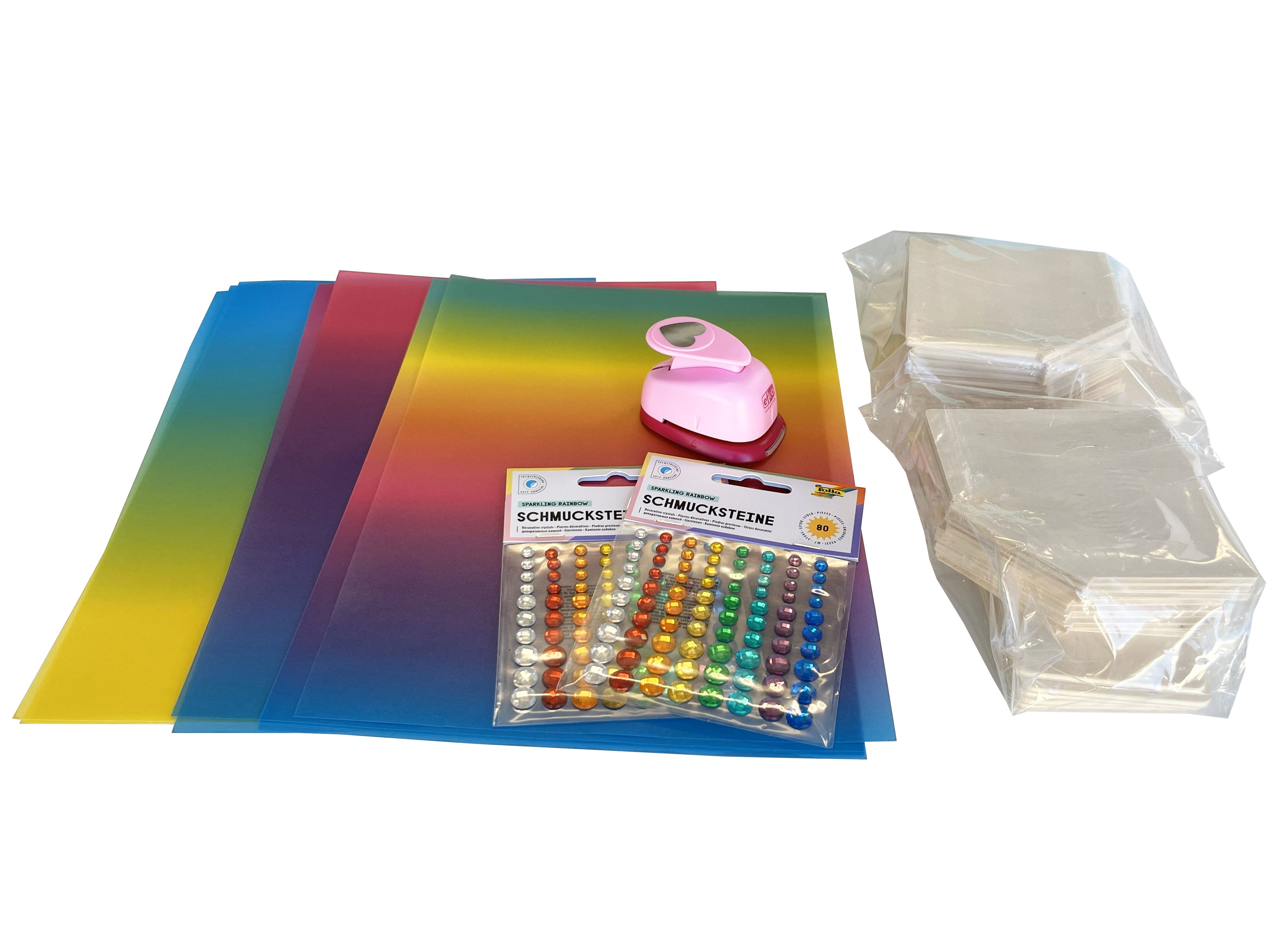 Ein fröhliches und tolles Geschenk, einfach herzustellen im praktischen Sparset. Zuerst die bunten Herzen ausstanzen. Klebt anschliessend diese Herzen mit einem beliebigen Bastelkleber (im Set nicht enthalten) auf die Seitenwände des Serviettnhaltes. Das geht am besten bevor er zusammengesteckt wird. Mit dem Leim dürft ihr ruhig grosszügig sein und mit einem Pinsel oder dem Finger arbeiten. Bei kontakt mit Feuchtigkeit rollt sich das Pergamentpapier manchmel etwas. Einfach weiteren Leim darüberstreichen, dann ist euer Serviettenhalter auch gleich versiegelt und gut geschützt im Alltagsgebrauch. Nach dem trocknen die beiden Seiten mit genügend Druck in den Boden stecken und die selbstklebenden Schmucksteine draufkleben. Inhalt: 10x Serviettenhalter aus Holz 1x Transparentpapier Regenbogen 10 Blatt 1x Stanzer Herz 2x Schmucksteine selbstklebend bunt