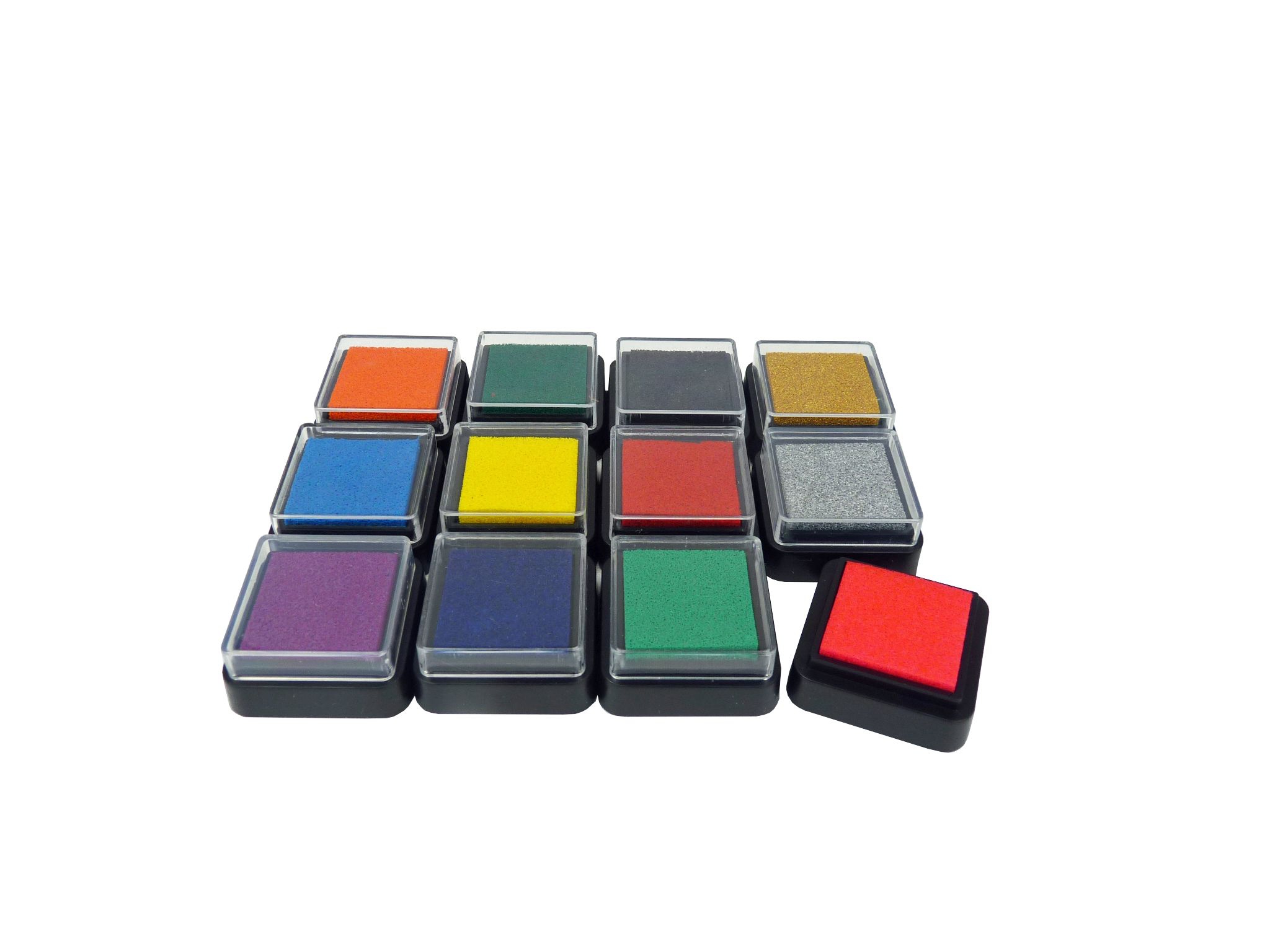 Schnelltrocknenede Pigment-Stempelfarbe. 12 wunderschöne, wasserlösliche Farben. Auch geeignet für glänzende und beschichtete Papiere.
