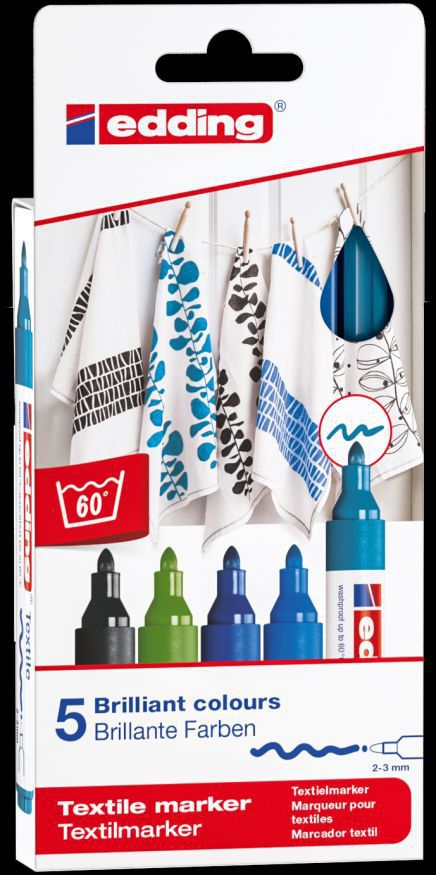 Textilmarker zum schreiben und malen auf fast allen, hellen, appreturfreien Textilien. Ohne Dampfbügeln fixierbar. Waschfest bis 60 Grad. Tinte auf Wasserbasis in intensiven Farben und hoher Lichtbeständigkeit. Waagrecht lagern.