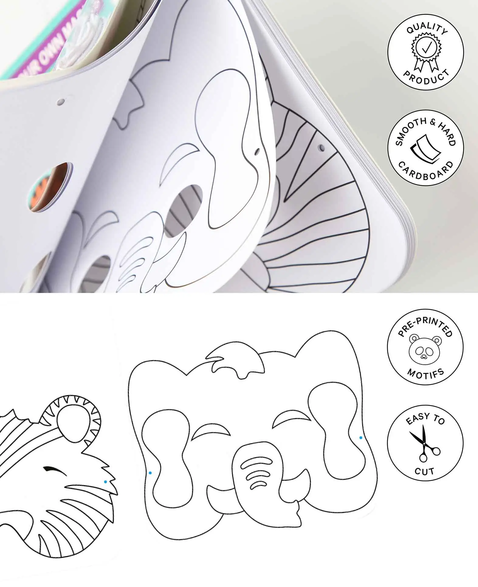 Set mit 12 Papiermasken (4 Motive à 3 Masken), mit vorgedruckten Designs und elastischen Gummibändern für angenehmen Tragekomfort. Leichtes Material, einfach zu schneiden, formen und anpassen. Masken können mit Aufklebern, Glitter, Moosgummi, Farbstiften und weiteren Bastelmaterialien personalisiert werden. Grösse: ca. 18 × 19 cm