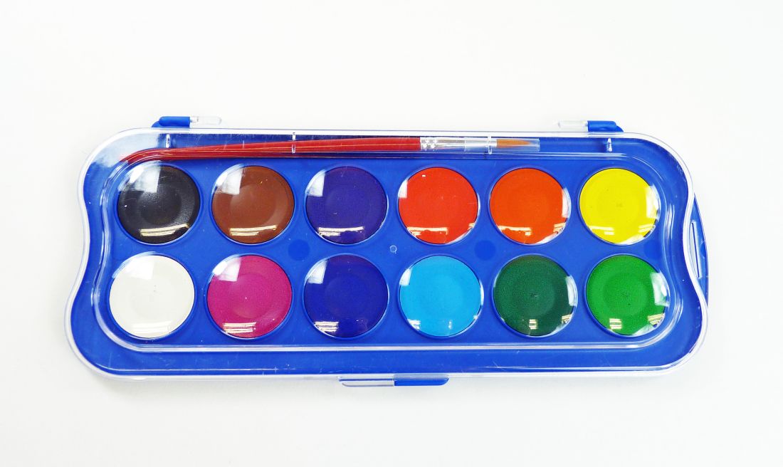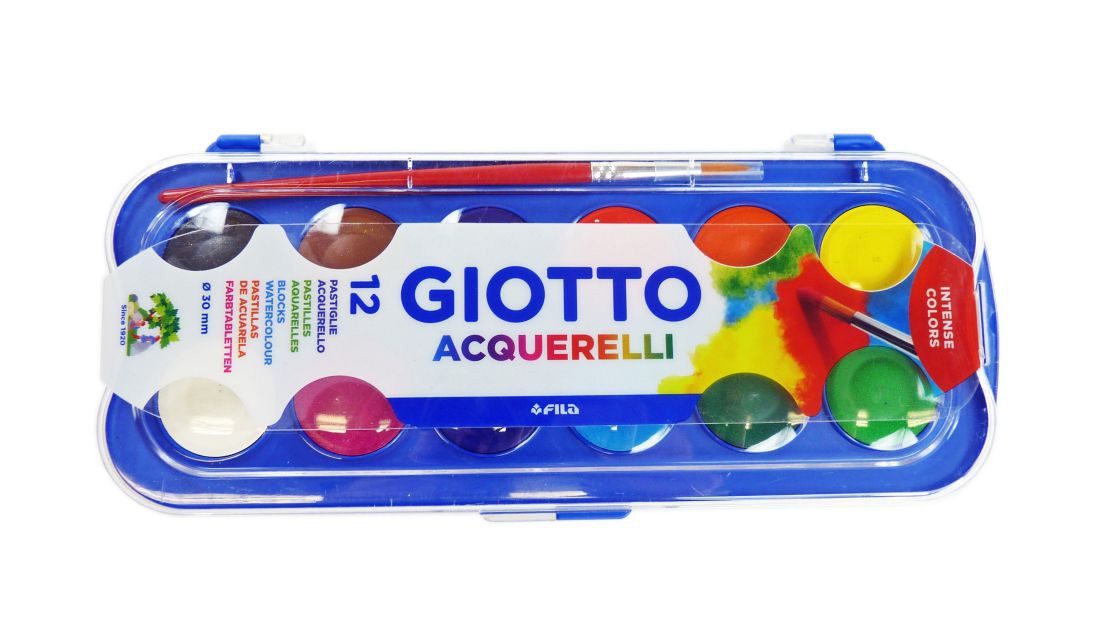 12 lebhafte und deckende Farben inkl. Pinsel in praktischer Palette.